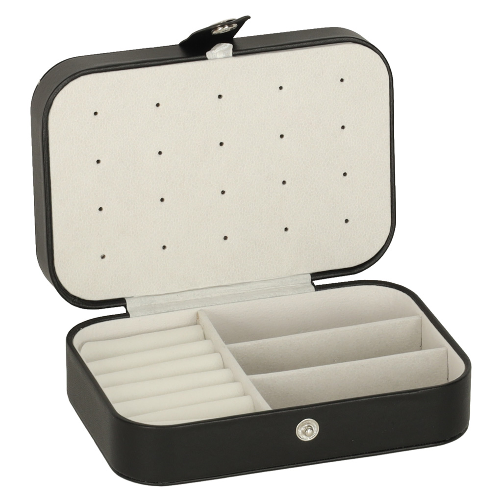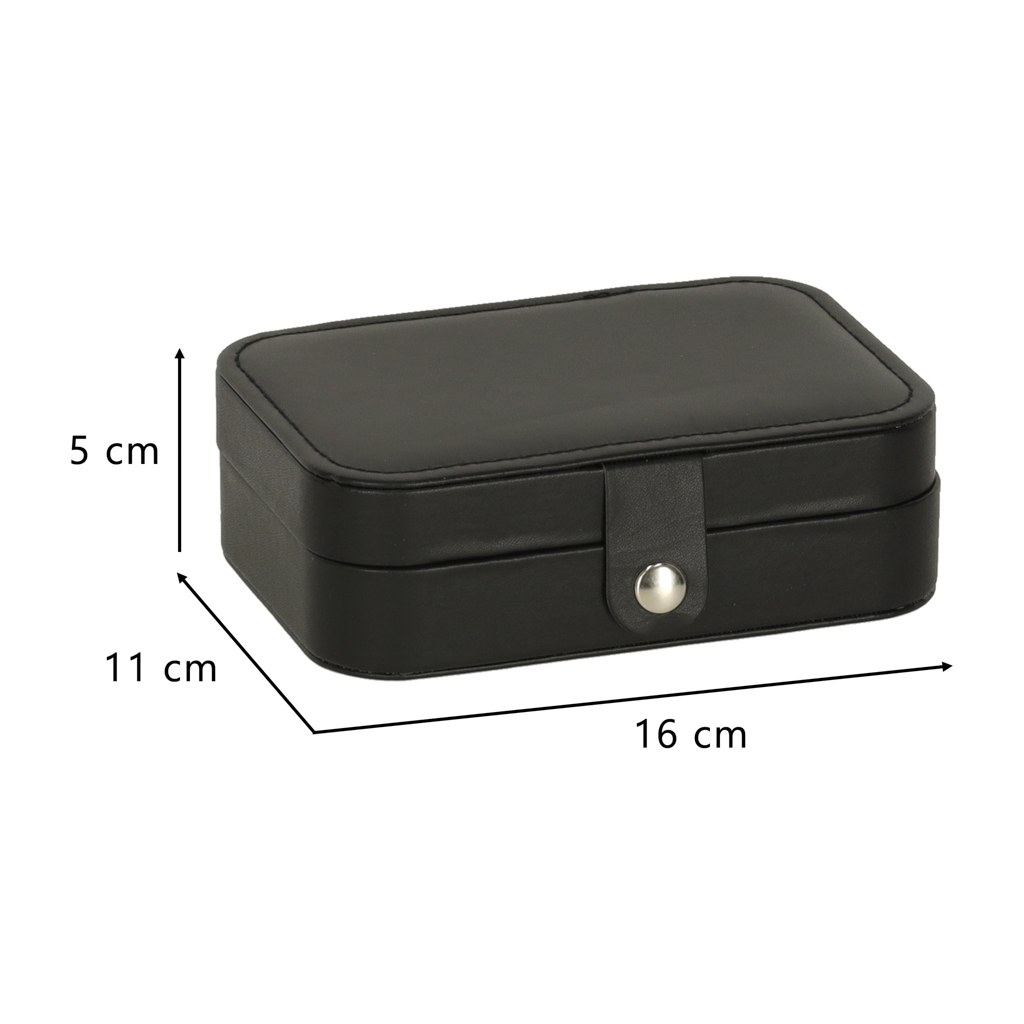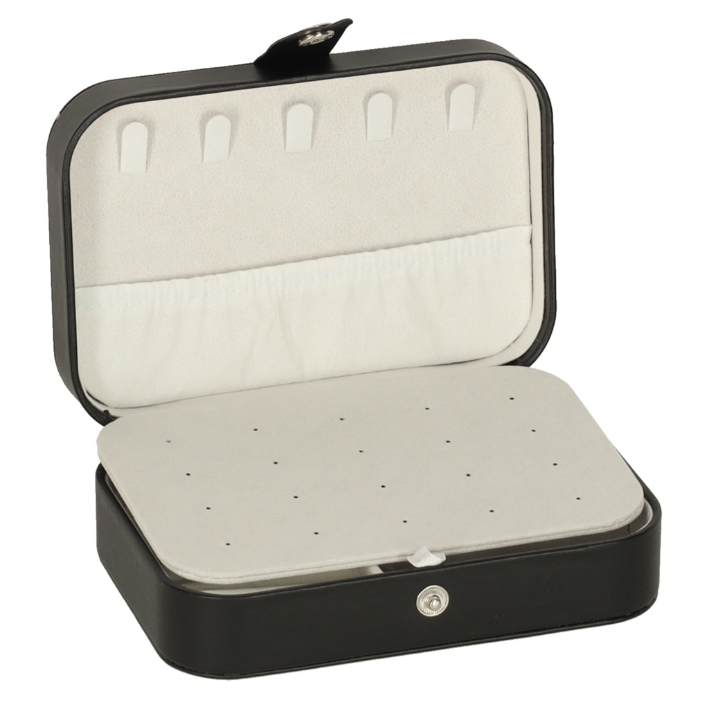 Stylowa kasetka w klasycznej czerni z jasnym wnętrzem doskonale wpasuje się w wystrój każdej toaletki. Kompaktowy rozmiar 16 × 11 × 5 cm sprawia, że jest idealna do torebki czy walizki, a przemyślany układ przegródek i haczyków zapewnia funkcjonalność i zaskakującą pojemność.