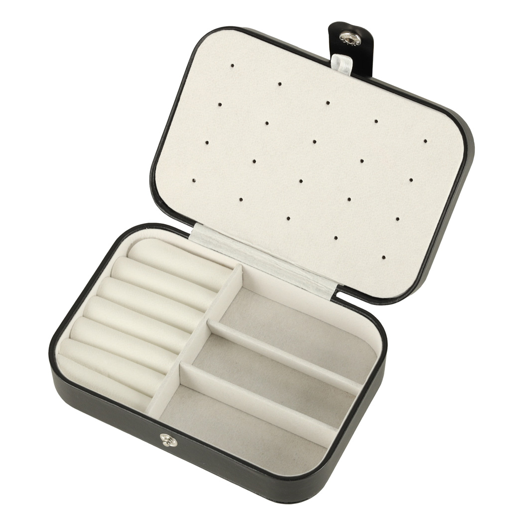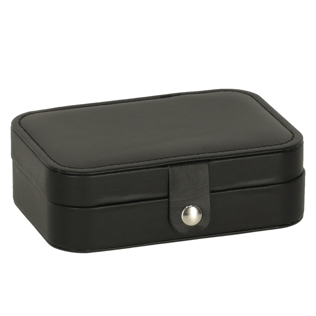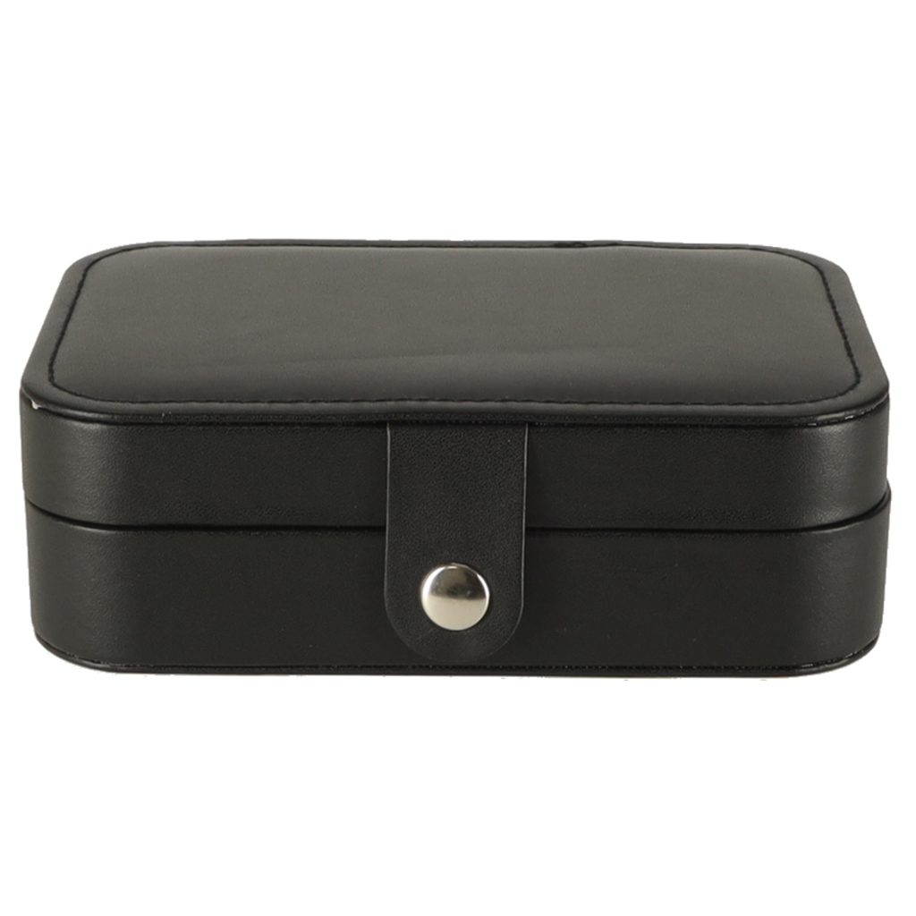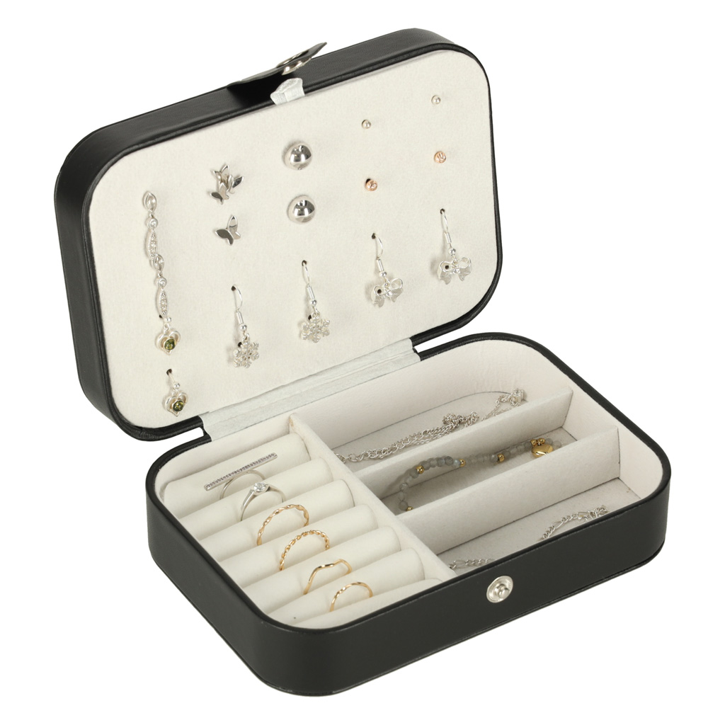 Stylowa kasetka w klasycznej czerni z jasnym wnętrzem doskonale wpasuje się w wystrój każdej toaletki. Kompaktowy rozmiar 16 × 11 × 5 cm sprawia, że jest idealna do torebki czy walizki, a przemyślany układ przegródek i haczyków zapewnia funkcjonalność i zaskakującą pojemność.