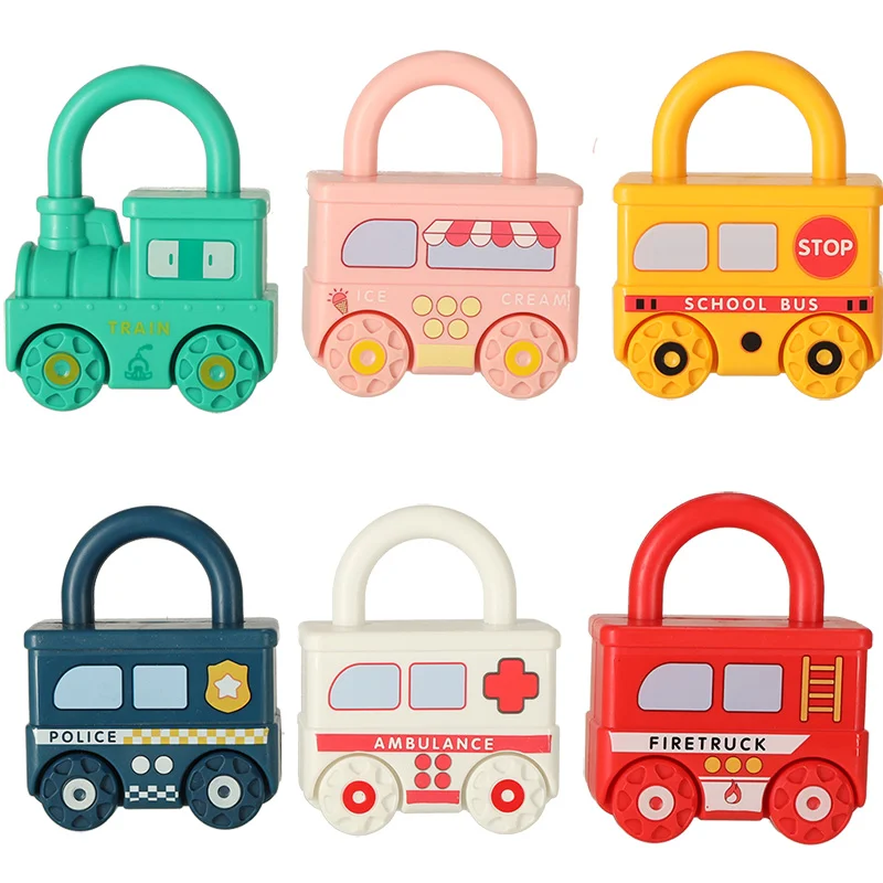 Zabawka edukacyjna łamigłówka samochodziki z wagonikami kłódkami wagoniki kłódki z kluczykami autka Montessori 13 el.