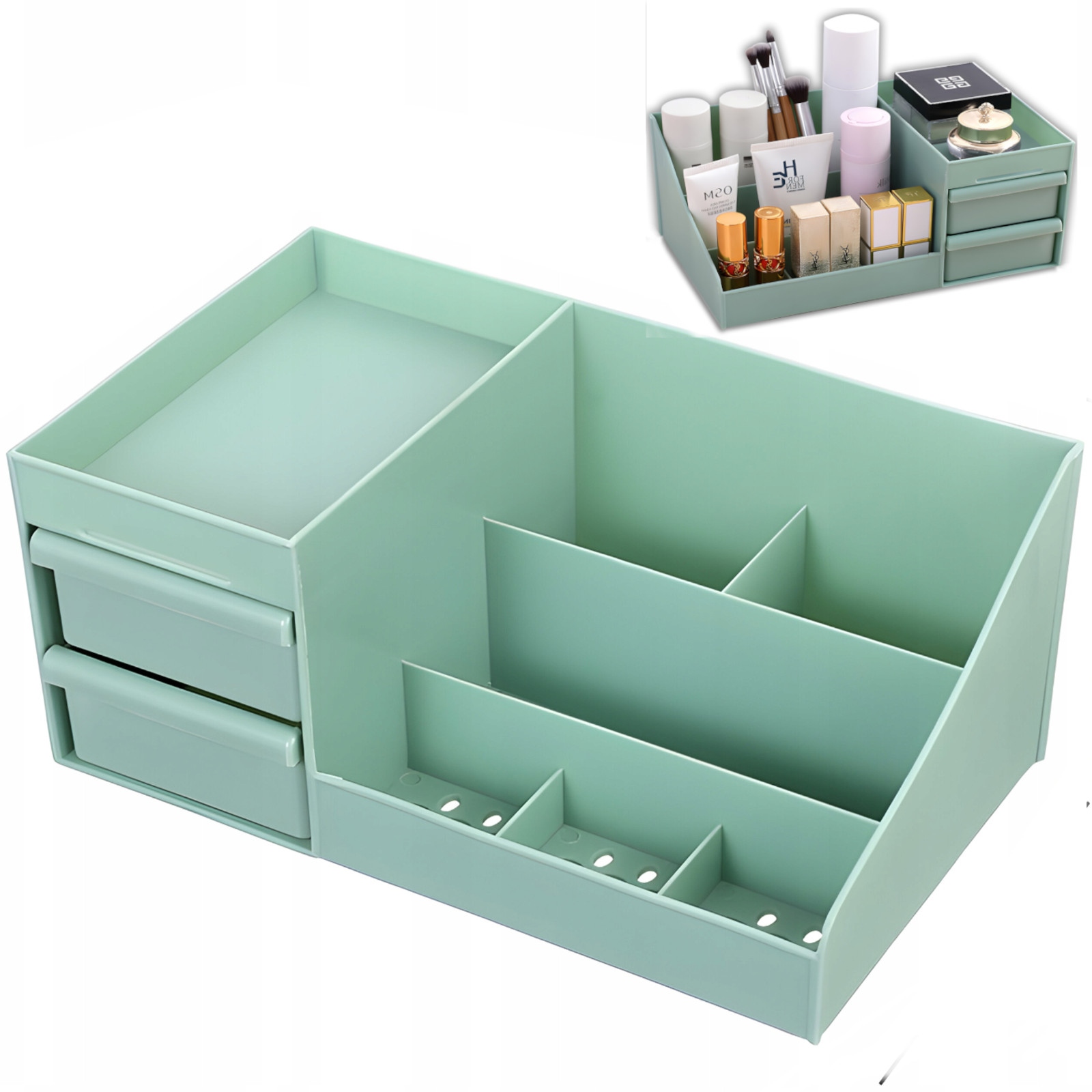 Organizer łazienkowy na kosmetyki biżuterię 2 szuflady 7 przegród - zielony