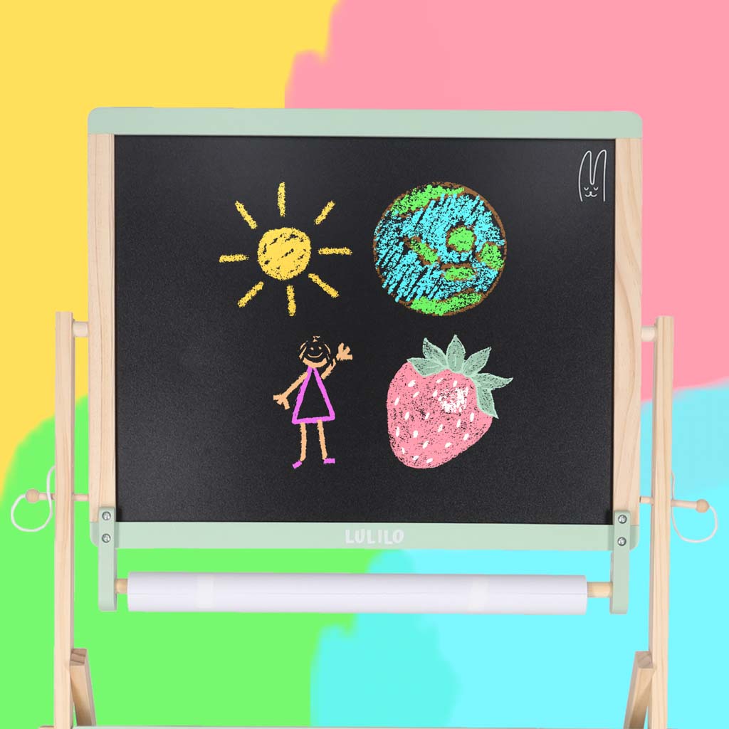 Obrotowa tablica kreatywna LULILO Kredo przyda się w domu, w szkole oraz w świetlicy. Dziecko może z niej korzystać po ukończeniu 3. roku życia. Dzięki wielofunkcyjnej tablicy dziecko może w pełni uwolnić swoją kreatywność. Koniec z pisaniem po ścianach – na tablicy 3w1 maluch może pisać i malować kredą, kredkami lub markerami.