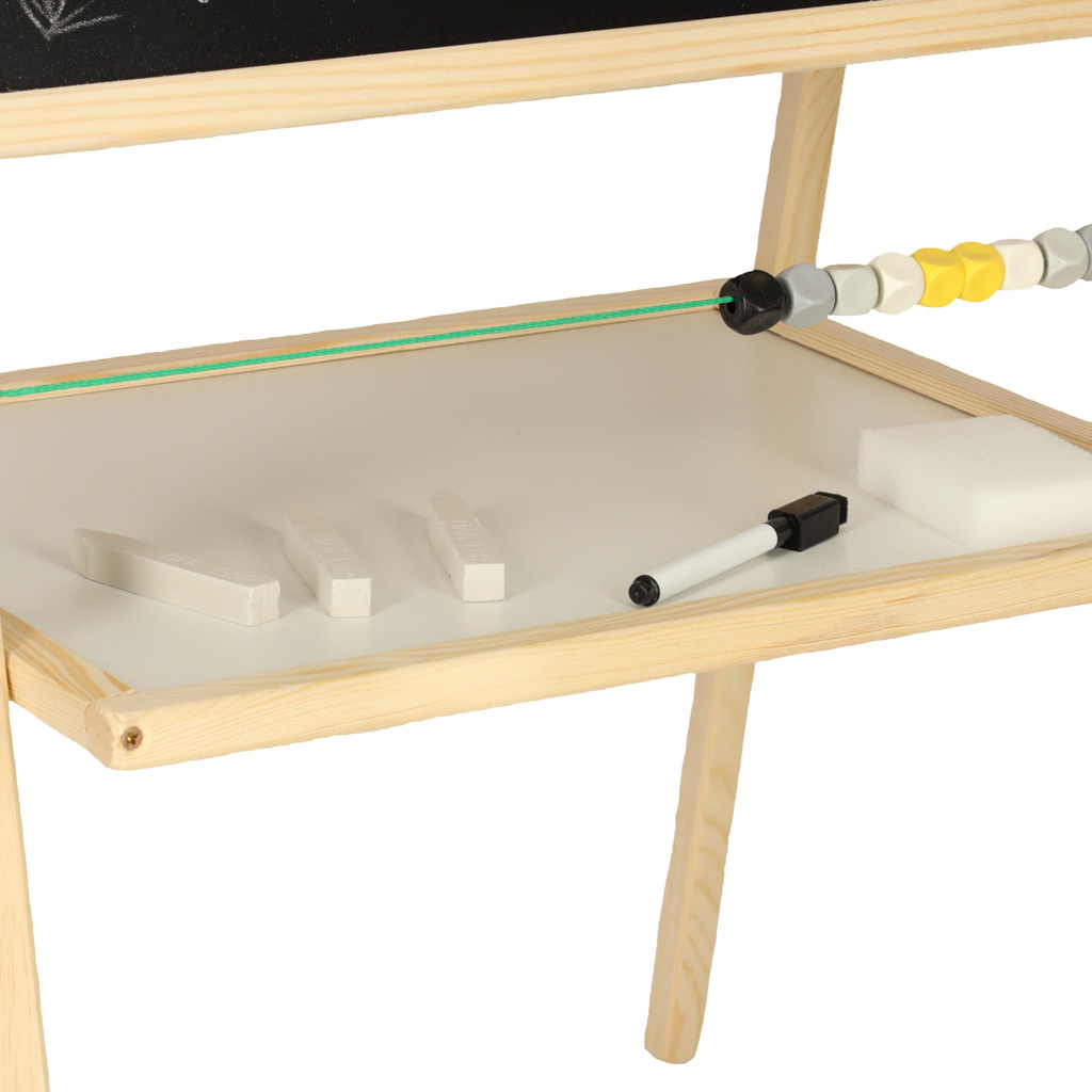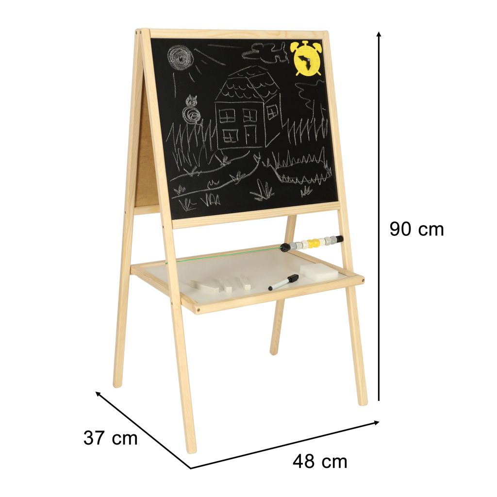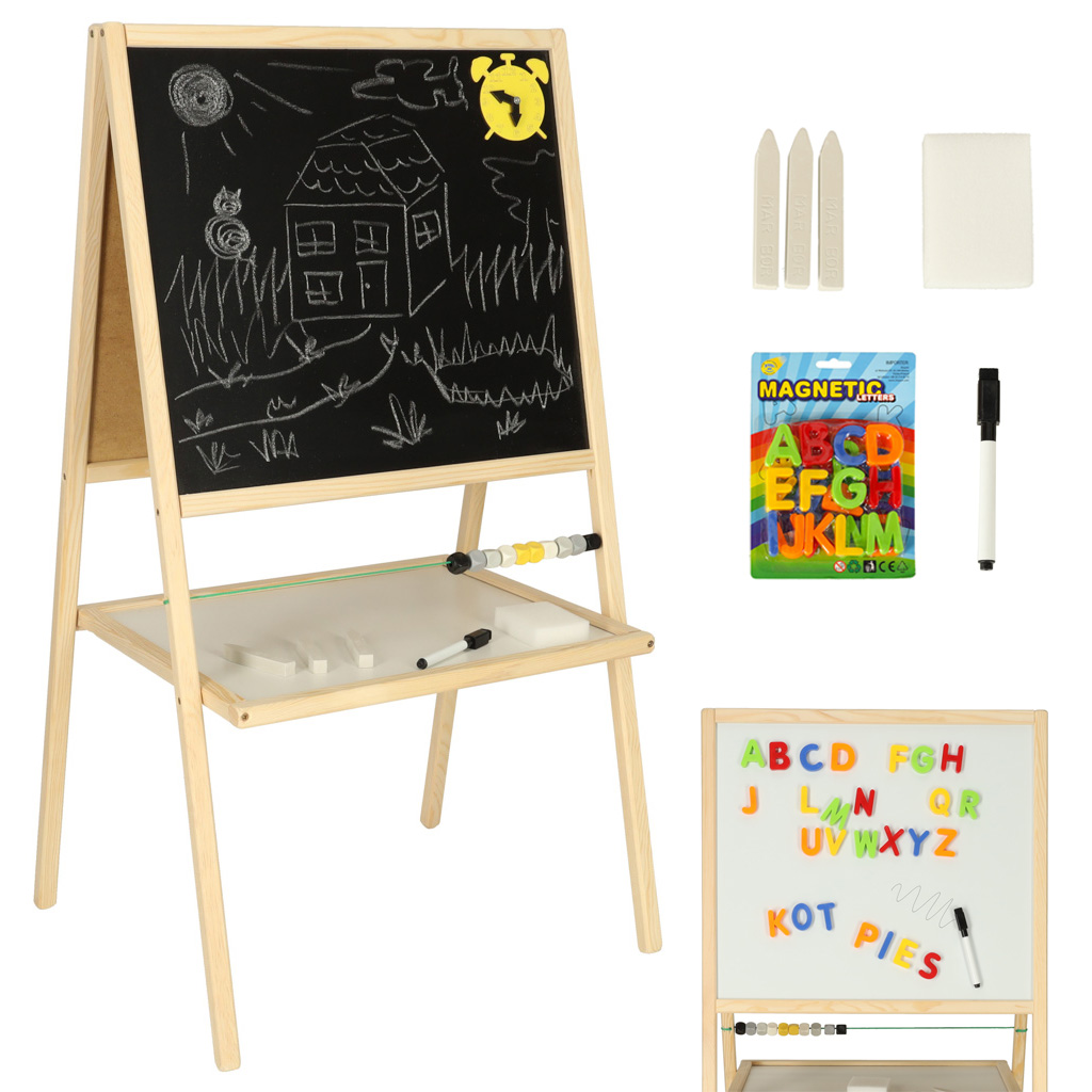 Półka pod tablicą umożliwia przechowywanie akcesoriów w zasięgu ręki, co sprzyja porządkowi podczas zabawy. Tablica idealnie sprawdzi się w domu, przedszkolu czy klasie, oferując dzieciom niezliczone godziny kreatywnej rozrywki.
