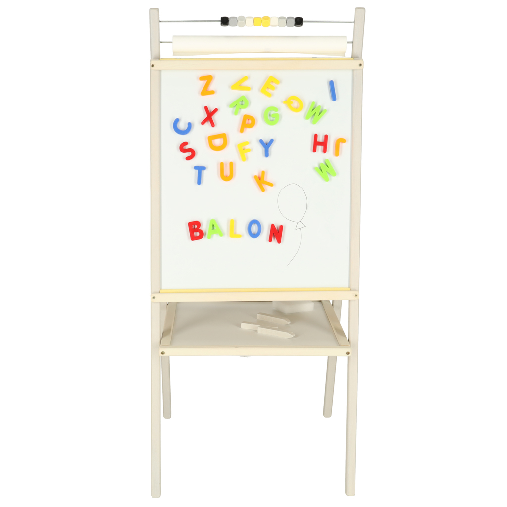 W zestawie znajduje się wszystko, co potrzebne do rozpoczęcia twórczej zabawy: kreda, gąbka, mazak oraz magnesy w kształcie liter. Solidna drewniana konstrukcja zapewnia stabilność i trwałość, a praktyczna półka pod tablicą ułatwia przechowywanie akcesoriów.
