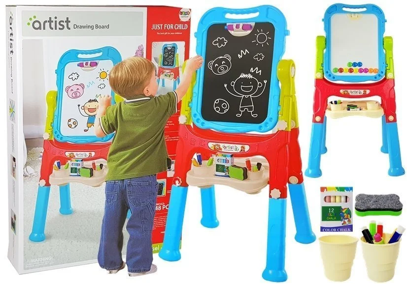 Wielofunkcyjna tablica sprawi radość nie jednemu artyście, ale również może stanowić pomoc naukową. Rysowanie kredą i pisakami to coś dla dziecka, które uwielbia rysować. Czerwono- niebieska tablica pasuje do każdego pokoju dziecięcego. Rysowanie na tablicy rozwinie u dziecka zdolności plastyczne, wyobraźnię i dokładność, funkcje ręki oraz koordynację oko-ręka.