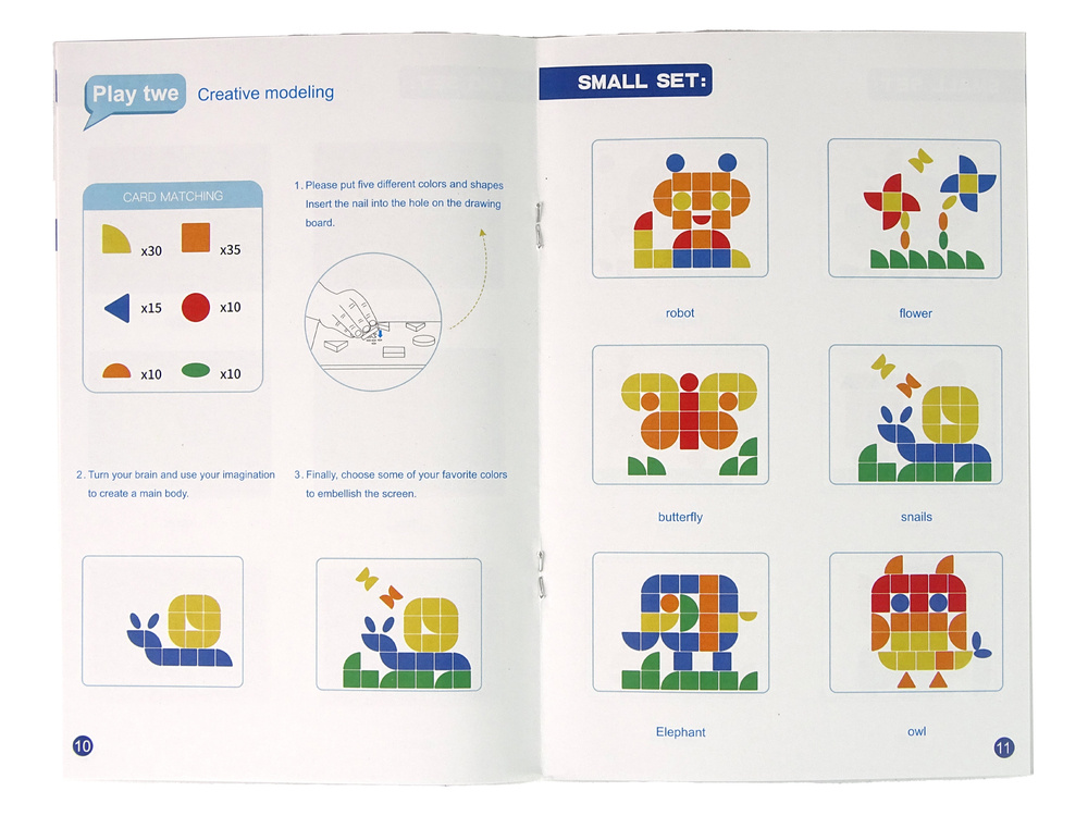 Cały zestaw składa się 112 sztuk. W środku znajdują zestaw małych klocków w różnych kształtach geometrycznych. Bez problemu możesz je przyczepić do tablicy i ułożyć z nich wzór. Książeczka dołączona do zestawu przedstawia przykładowe obrazki.