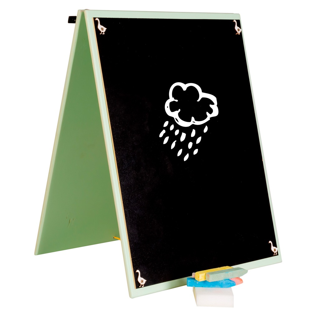 Tablica jest dwustronna, co oznacza, że z drugiej strony znajduje się tablica kredowa, idealna do rysowania. W zestawie znajdują się kreda oraz gąbka do ścierania, co pozwala na natychmiastową zabawę.