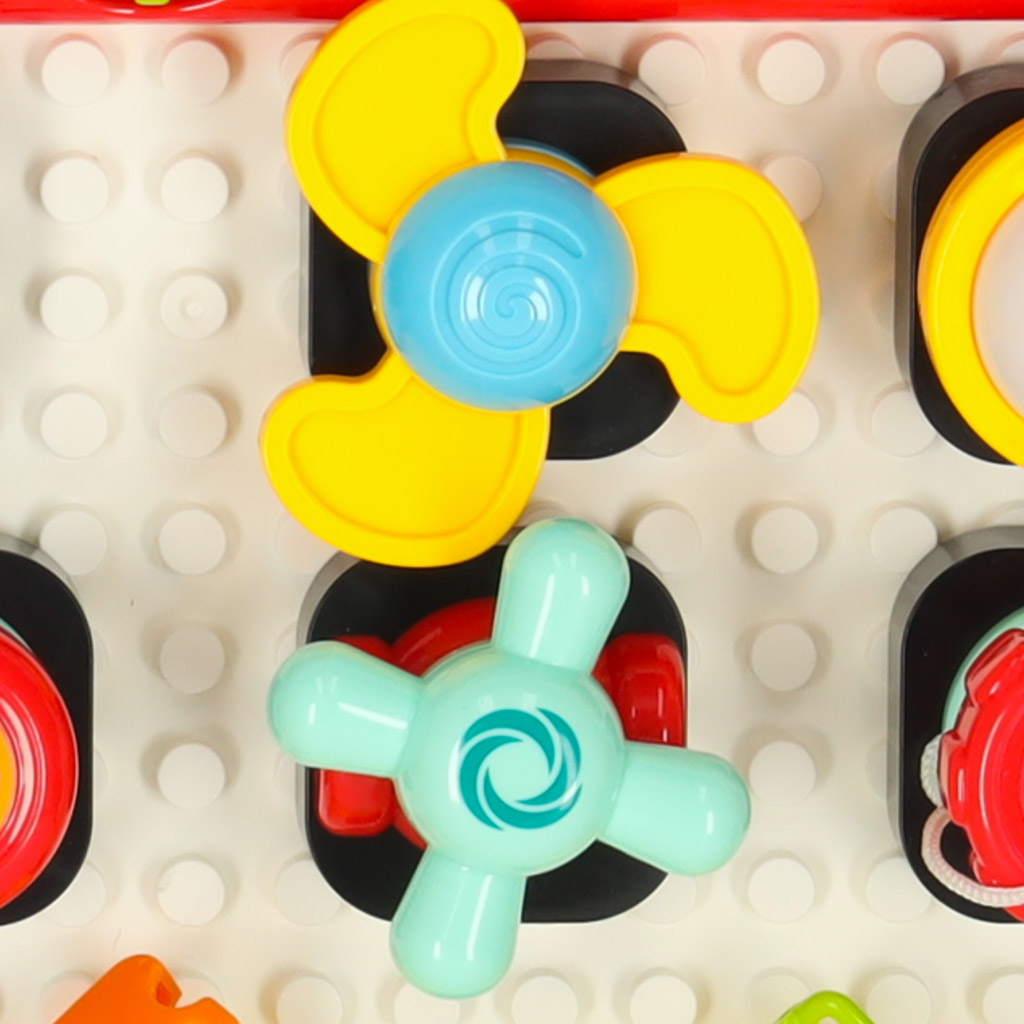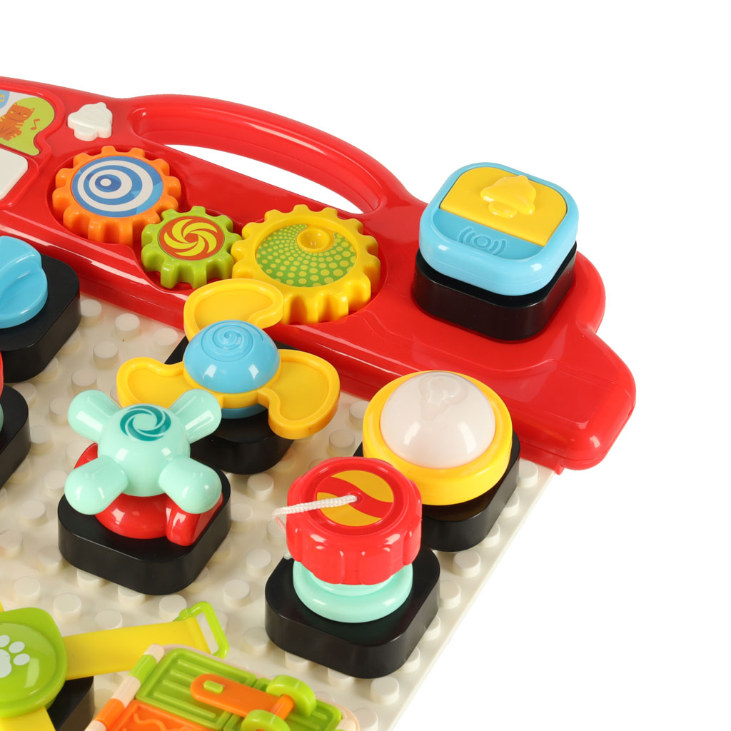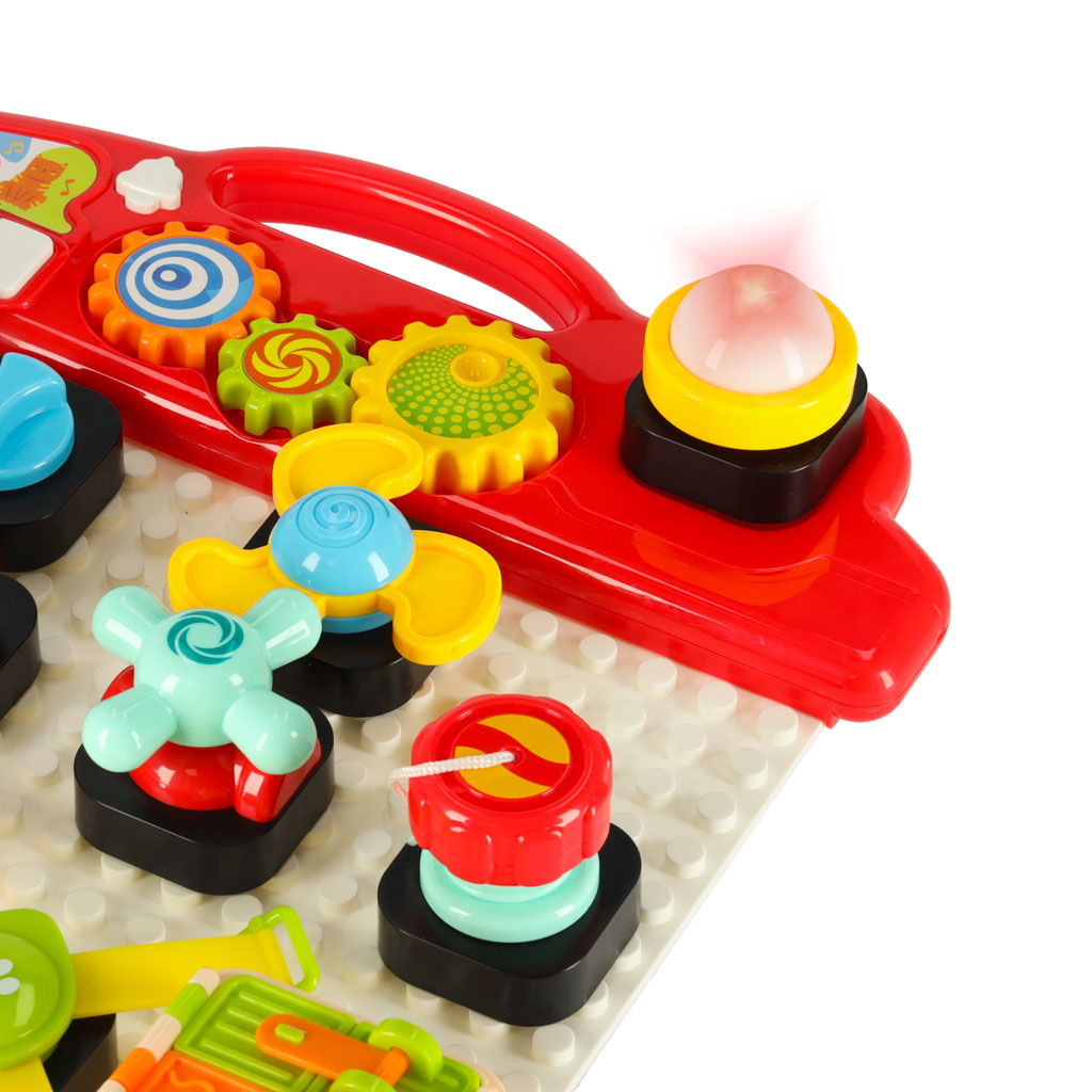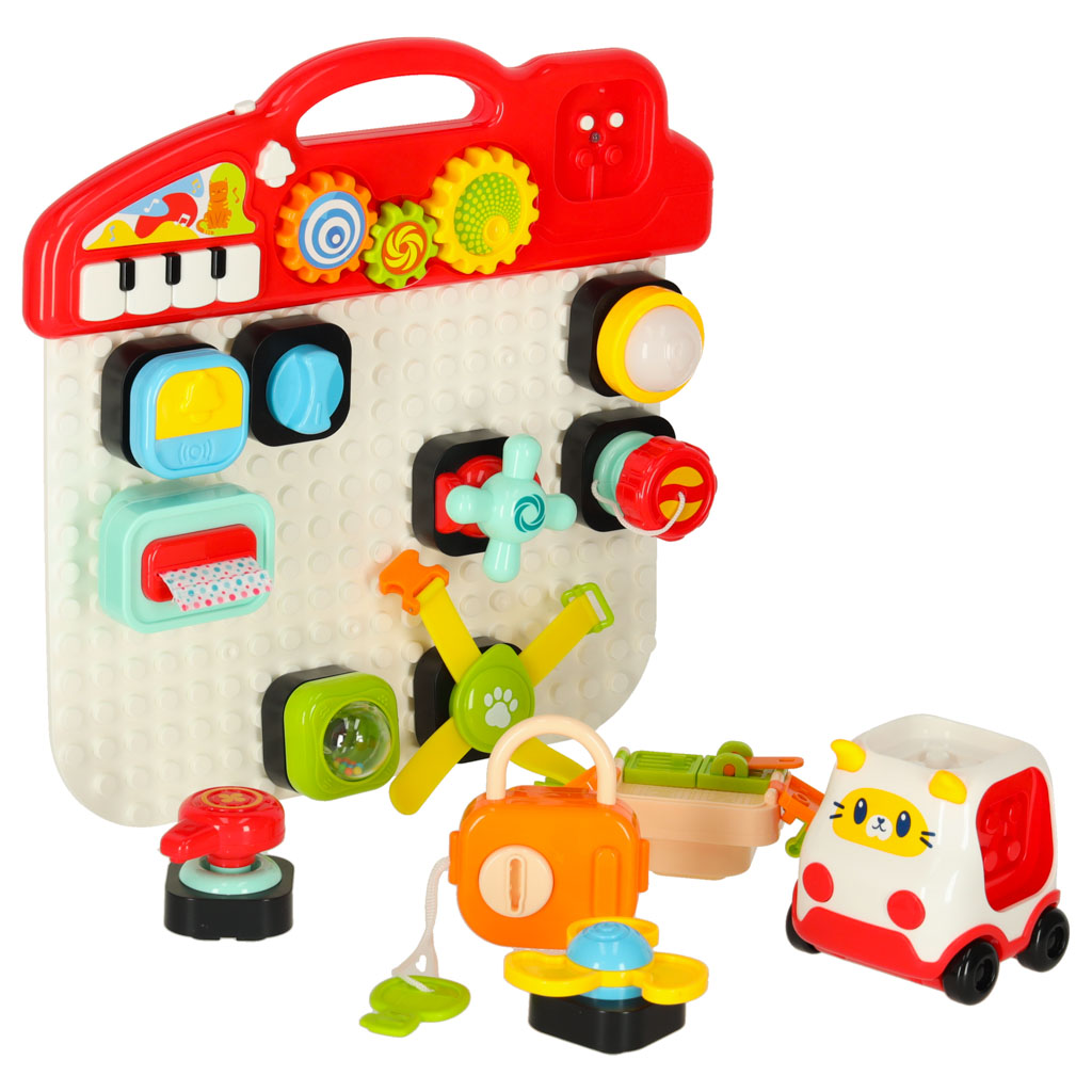 Interaktywna tablica edukacyjna to doskonałe narzędzie wspierające rozwój dzieci od 18 miesiąca życia. Dzięki niej maluchy mogą rozwijać swoje umiejętności sensoryczne oraz motorykę. Tablica zachęca do zabawy, w trakcie której dziecko może układać klocki i odkrywać różne dźwięki oraz światła, które aktywują się po włożeniu baterii.
