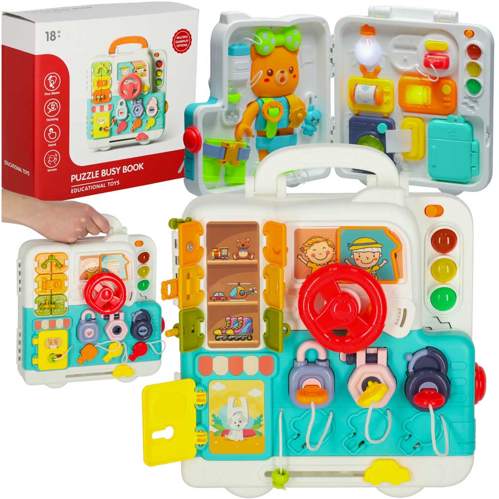 Tablica manipulacyjna to doskonałe połączenie zabawy i nauki, idealna dla dzieci od 18 miesiąca życia. Dzięki niej maluchy rozwijają swoje zdolności manualne oraz logiczne myślenie poprzez interakcję z różnorodnymi elementami. Walizka jest lekka i poręczna, co sprawia, że można ją zabrać wszędzie – do dziadków, na wakacje czy spotkania z przyjaciółmi.