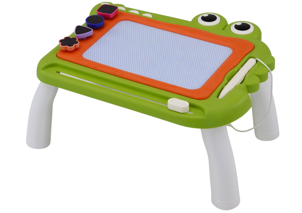 Tablica pełni funkcję małego stoliczka, co sprawia, że jest wszechstronną i praktyczną zabawką. Dodatkową atrakcją są stempelki, które pozwalają na tworzenie interesujących wzorów i zdobień, inspirując dziecko do jeszcze większej kreatywności i eksperymentowania.