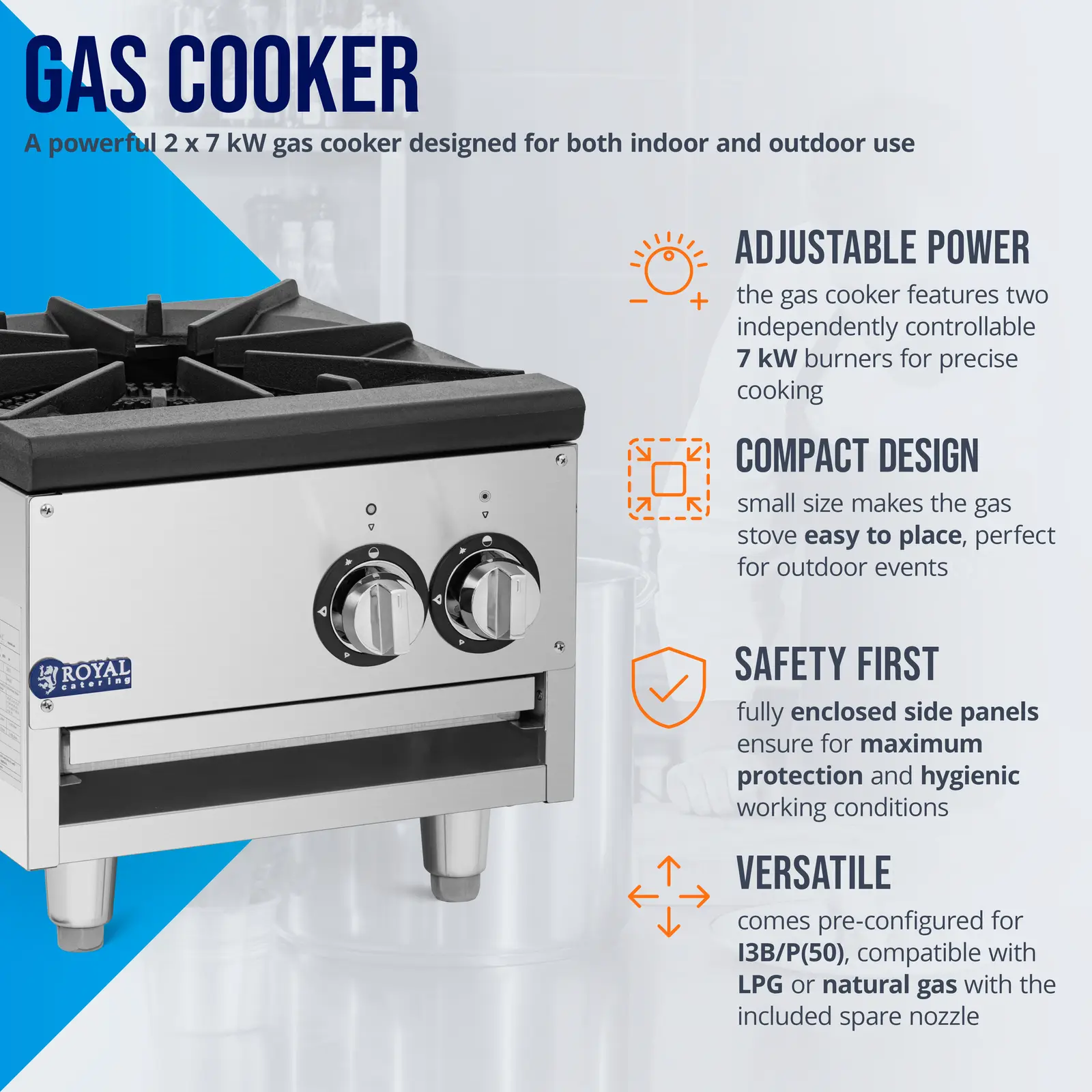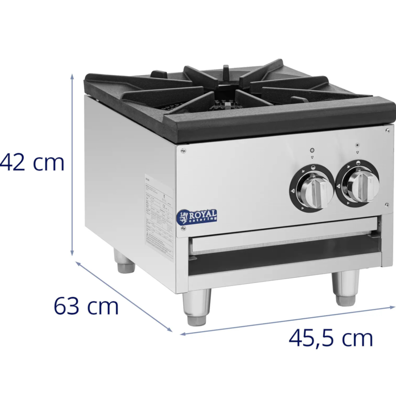 Taboret gazowy marki Royal Catering to idealne rozwiązanie dla profesjonalnych kuchni oraz imprez cateringowych. Oferuje dużą powierzchnię roboczą oraz dwa oddzielnie sterowane palniki, każdy o mocy do 7 kW. Dzięki potrójnej strukturze palnika pierścieniowego z zaworem odcinającym, można precyzyjnie ustawić płomień, co pozwala na efektywne gotowanie przy minimalnym zużyciu gazu.