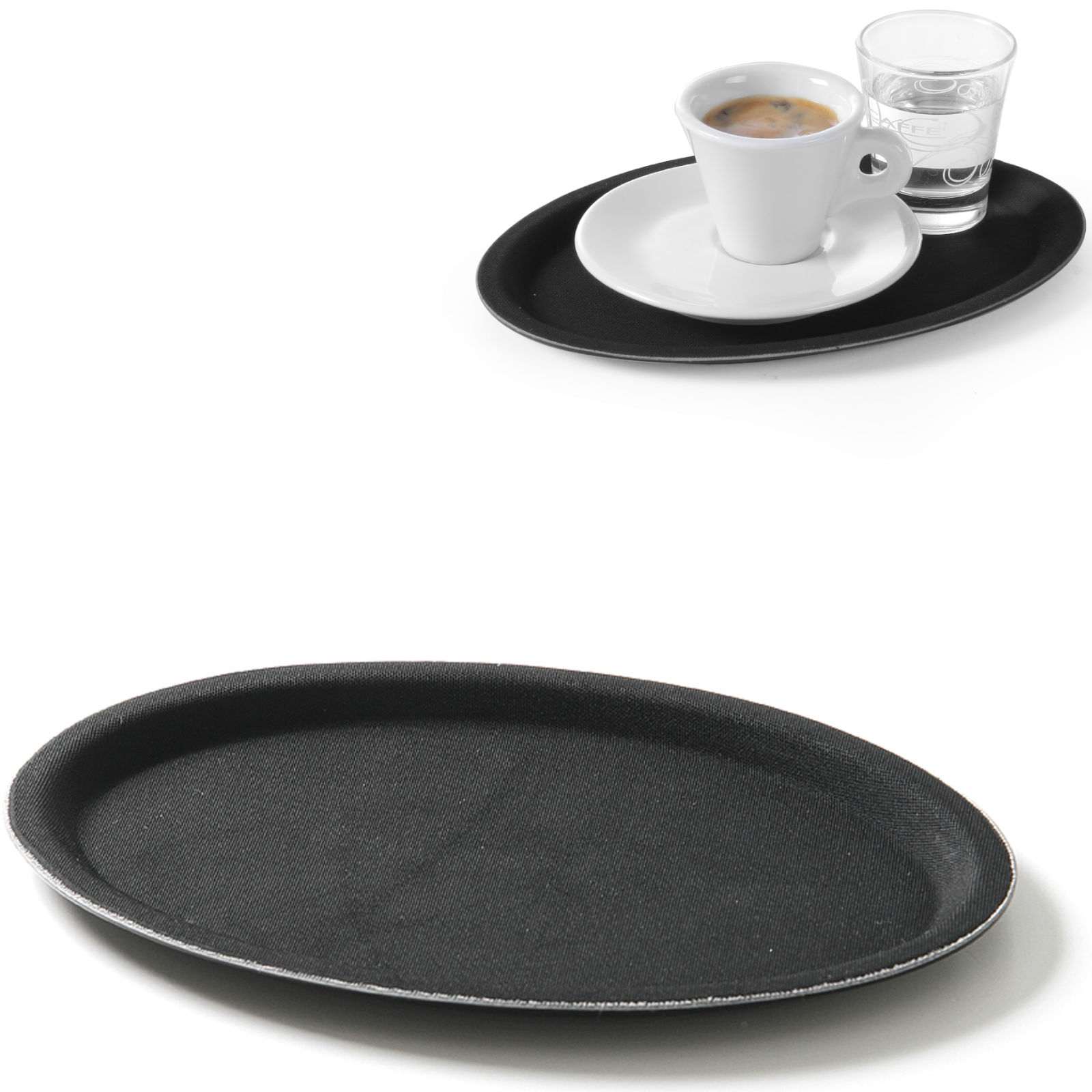 W zestawie znajduje się taca kelnerska antypoślizgowa owalna 21x29cm w kolorze czarnym, która z pewnością ułatwi codzienne obowiązki w każdym lokalu gastronomicznym.