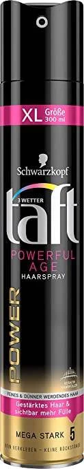 Odkryj, jak możesz cieszyć się piękną fryzurą mimo upływu lat. Lakier do włosów Taft Powerful Age z formułą keratynową oferuje sprężyste rezultaty stylizacji. Dzięki płynnej keratynie, która jest identyczna z naturalną keratyną we włosach, produkt ten wspiera strukturę Twoich włosów. Idealnie nadaje się dla osób, których włosy straciły grubość i siłę z wiekiem.