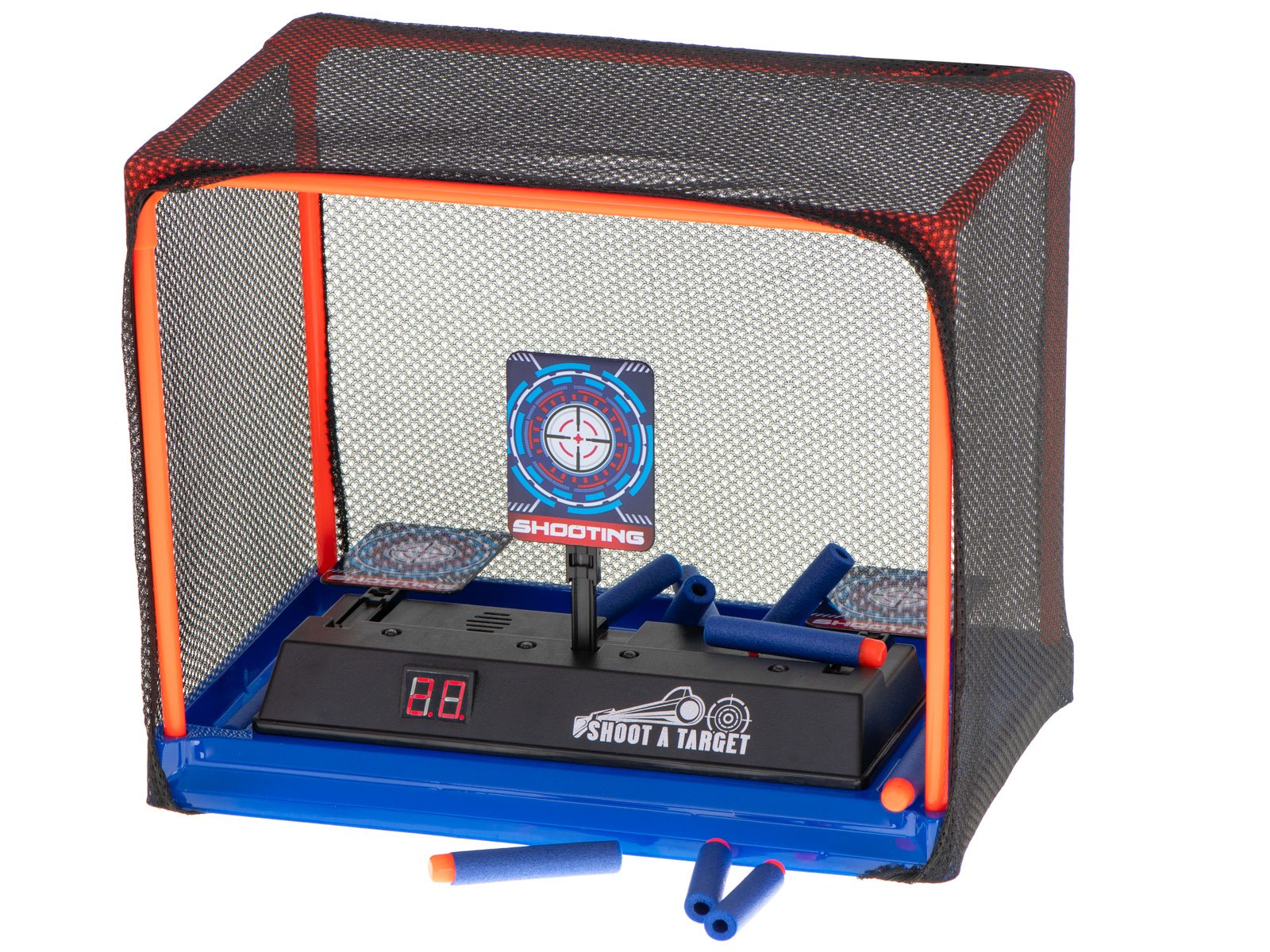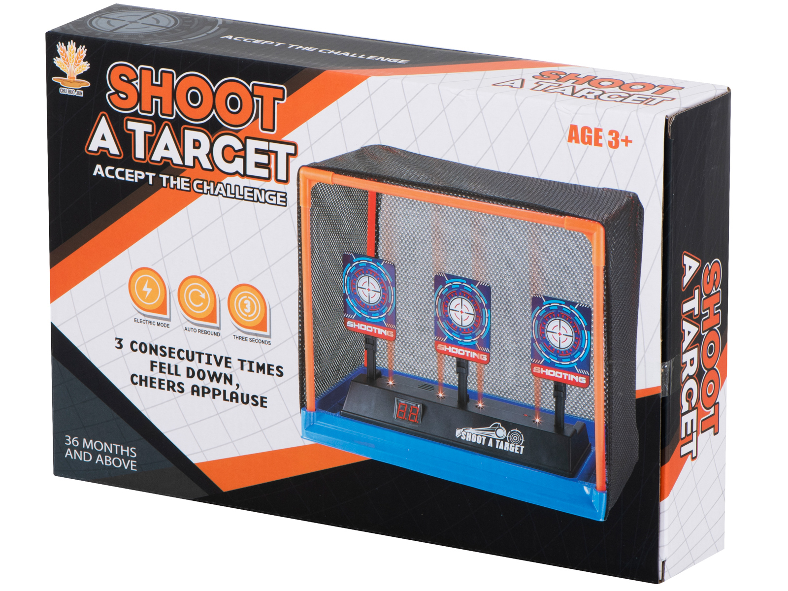 Tarcza jest kompatybilna z pistoletami na piankowe strzałki oraz kulki. Oferuje efekty świetlne i dźwiękowe, które umilają zabawę. Po trafieniu słychać dźwięk tłuczonego szkła lub oklaski. Tarcza posiada dwucyfrowy licznik punktów, a po zestrzeleniu trzech celów, wszystkie automatycznie się podnoszą.