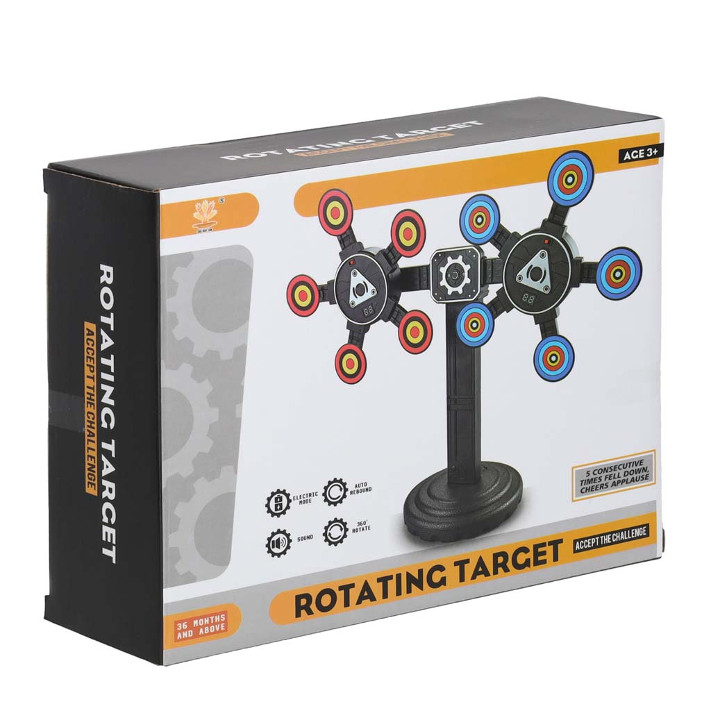 Ruchoma tarcza na baterie stanowi doskonałe uzupełnienie zestawów z miotanymi i strzelającymi zabawkami. Może posłużyć jako cel między innymi do pistoletów na bezpieczne naboje, miękkie strzałki oraz duże kulki. Tarcza ma obrotowe ramiona z pięcioma celami, a do tego kręci się wokół własnej osi. Przełączniki ON/OFF na tarczy pozwalają dostosować poziom trudności do uczestników zabawy.