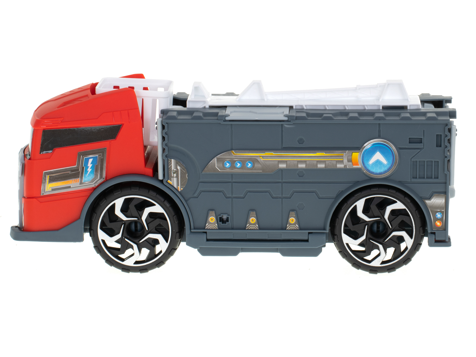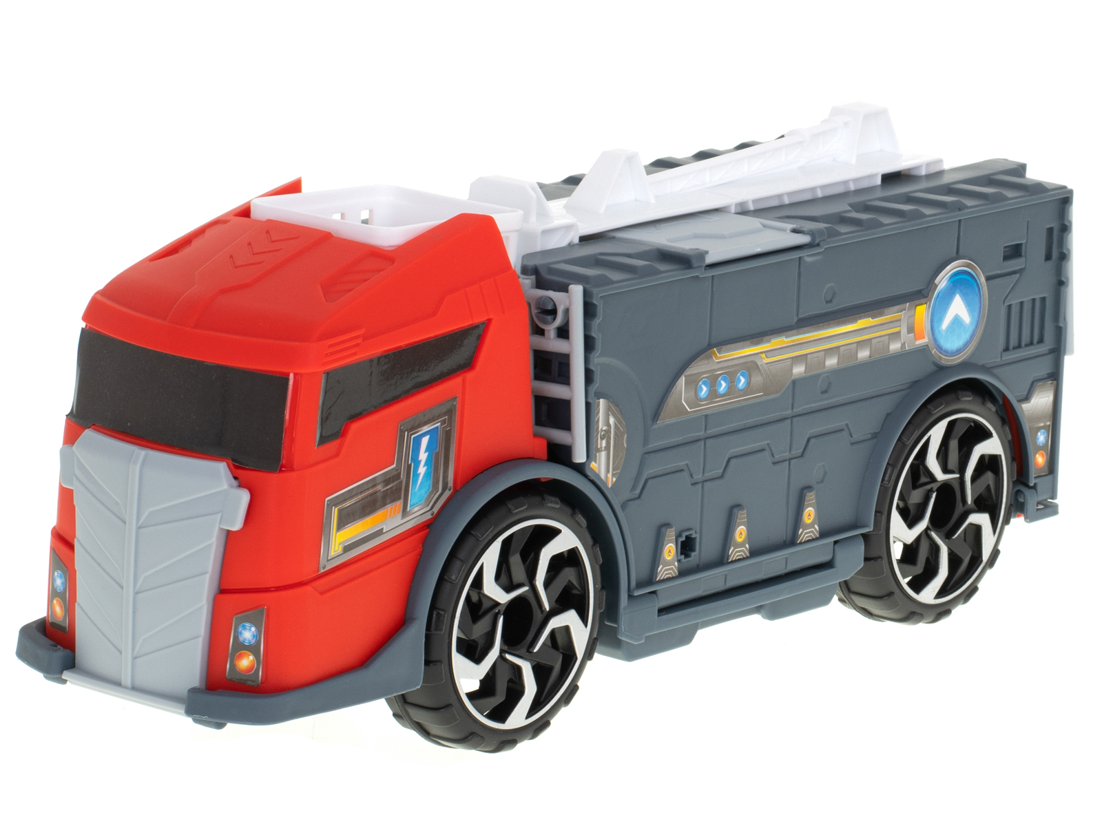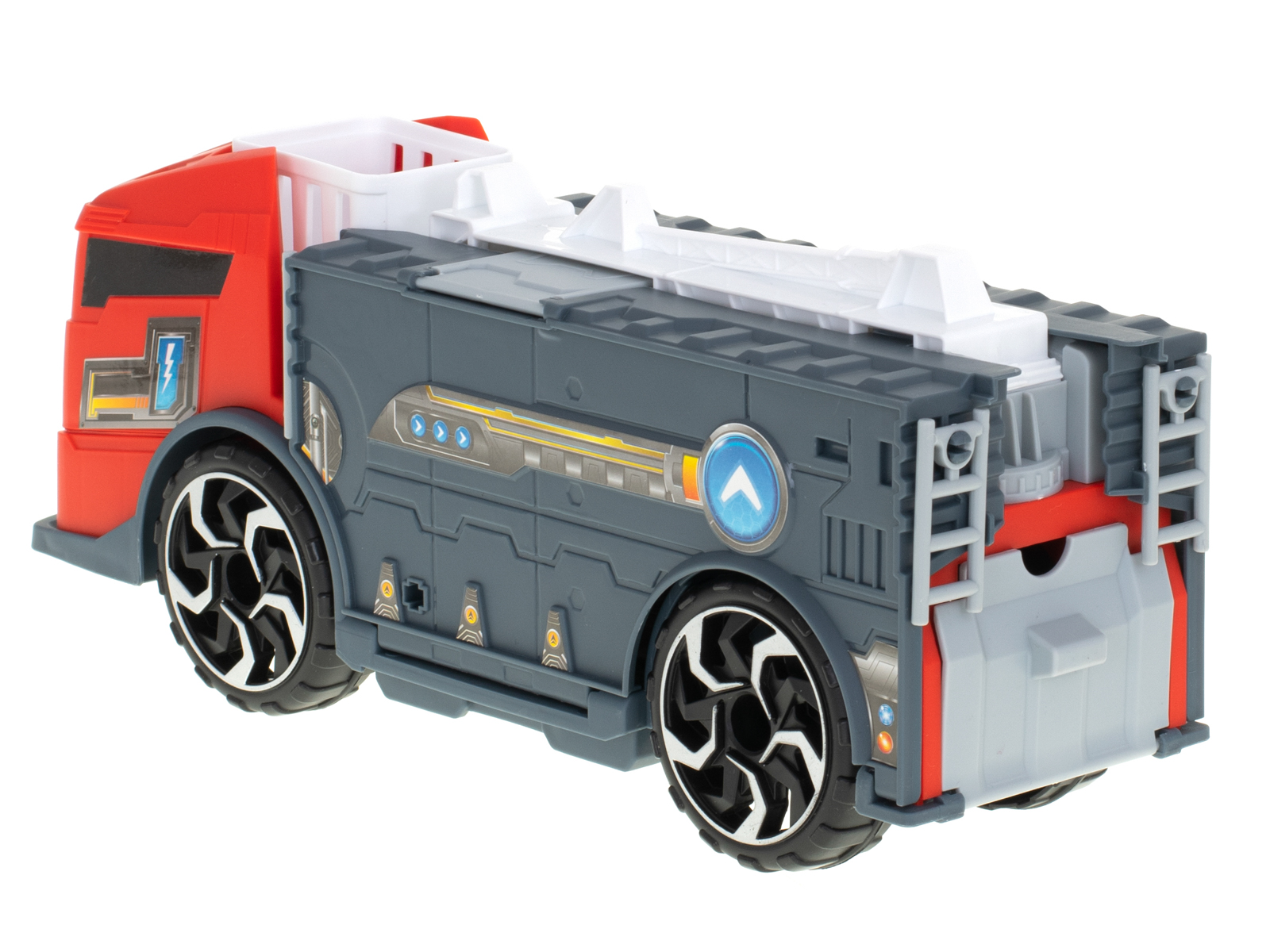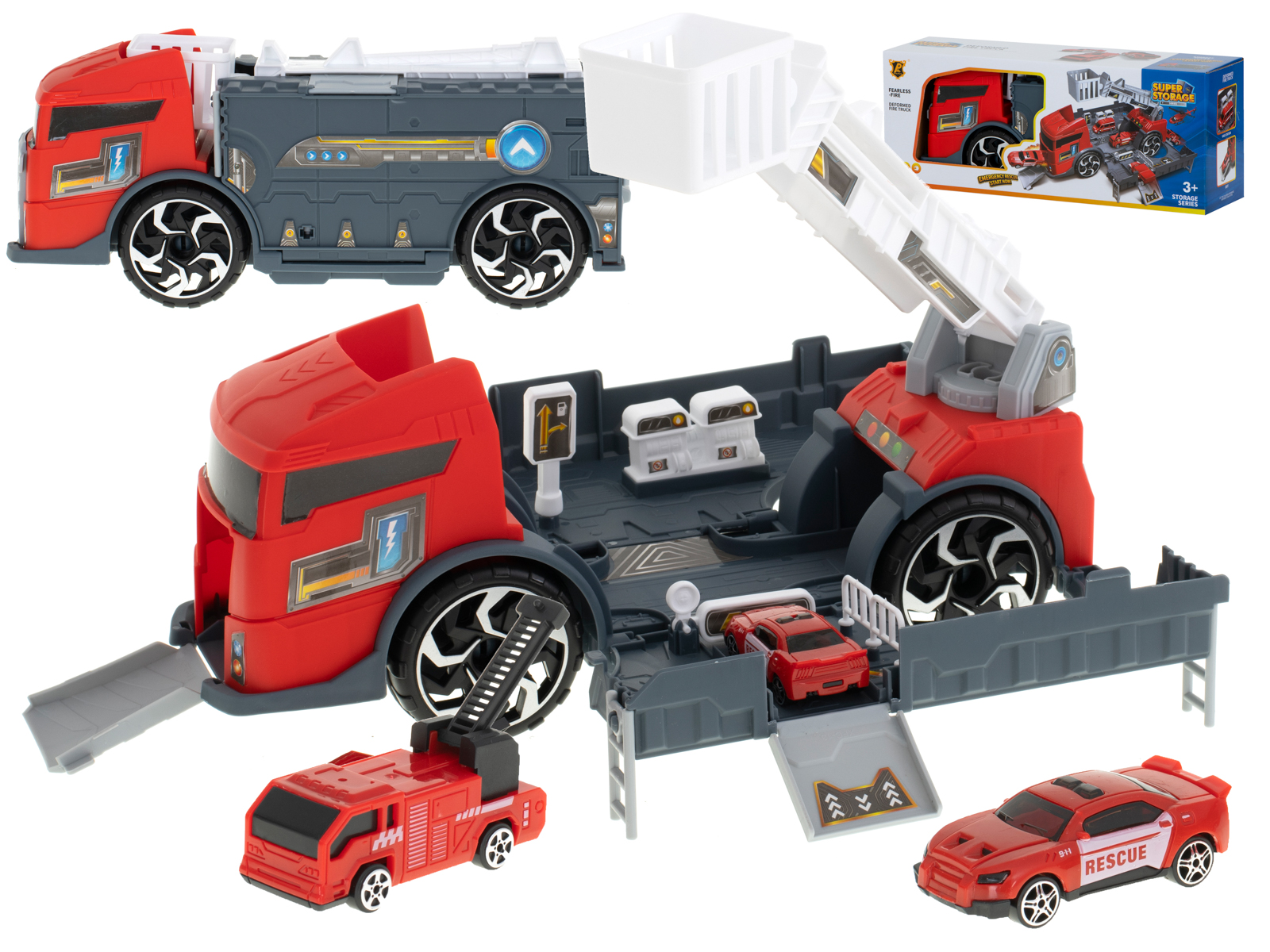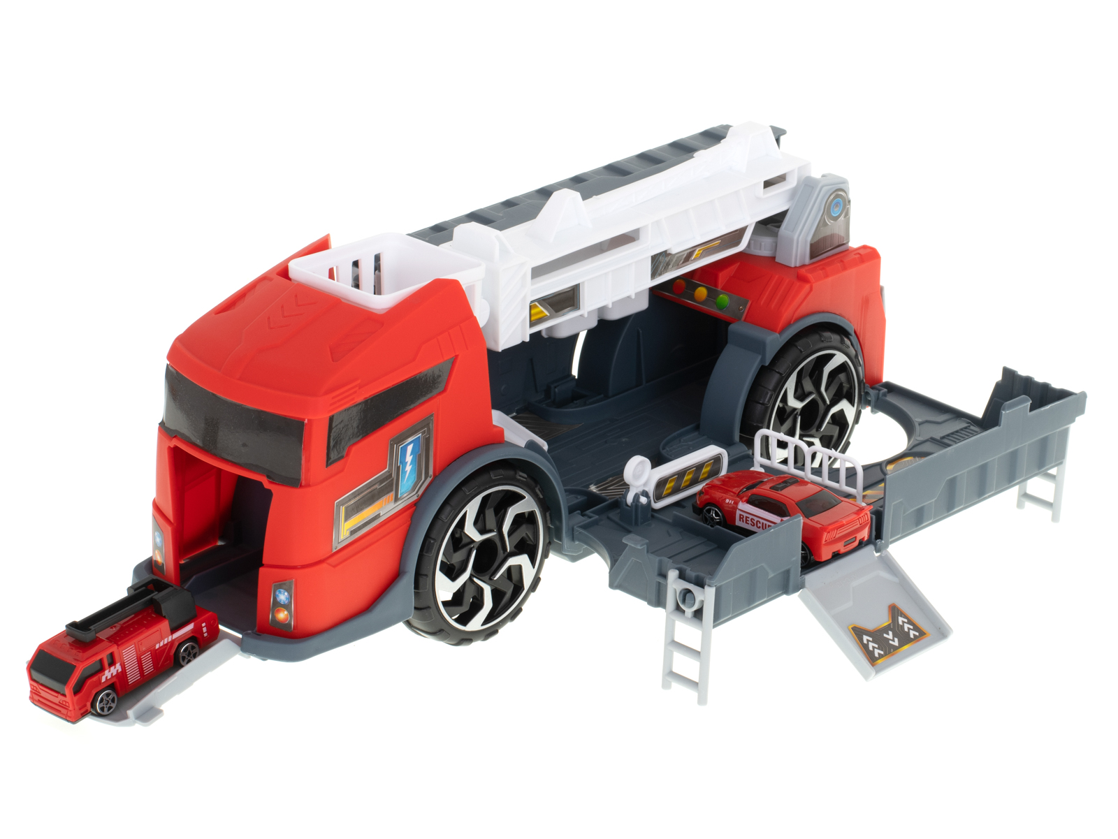Wjeżdżanie i wyjeżdżanie aut z transportera odbywa się po rampie, co dodaje realizmu zabawie. Ruchoma drabina i stacja paliw z dystrybutorami zwiększają możliwości zabawy. Dzieci uczą się o trajektorii, prędkości i innych zjawiskach fizycznych, co sprzyja ich rozwojowi.