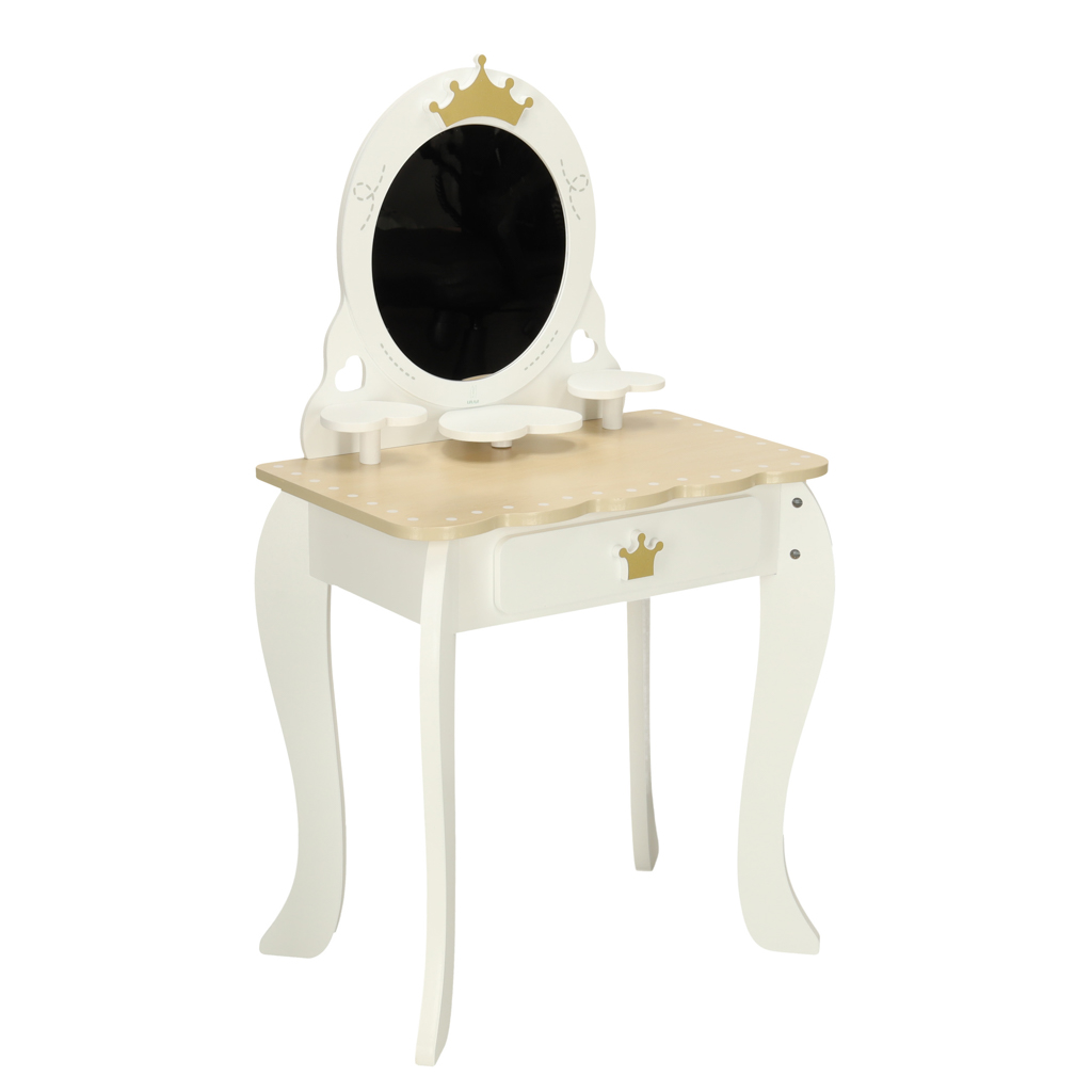 W zestawie znajdują się akcesoria takie jak: szczotka do włosów, suszarka, prostownica, paletka cieni, perfumy, lakier do paznokci i pomadka. Wszystkie akcesoria są atrapami, co zapewnia bezpieczeństwo podczas zabawy. Toaletka wykonana jest z drewna, które zostało wyszlifowane i pomalowane nietoksycznymi farbami. Biało-złota kolorystyka wprowadza minimalistyczny styl, idealny do pokoju dziecka.