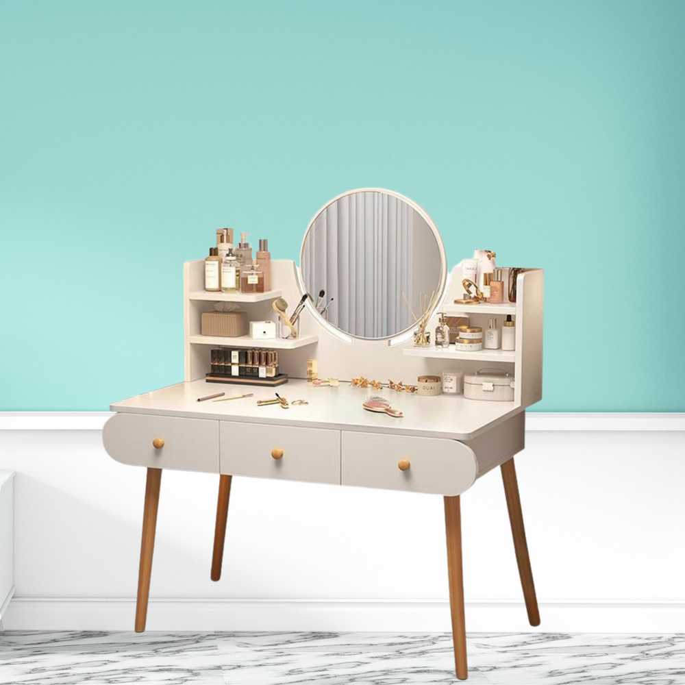 Trzy głębokie, pojemne szuflady ułatwiają przechowywanie kosmetyków, biżuterii oraz akcesoriów do włosów czy manicure – wszystko, czego potrzebujesz, znajdziesz na wyciągnięcie ręki. Otwarta przestrzeń na blacie i boczne półki umożliwiają praktyczne uporządkowanie często używanych produktów, jednocześnie nadając toaletce dekoracyjnego charakteru.