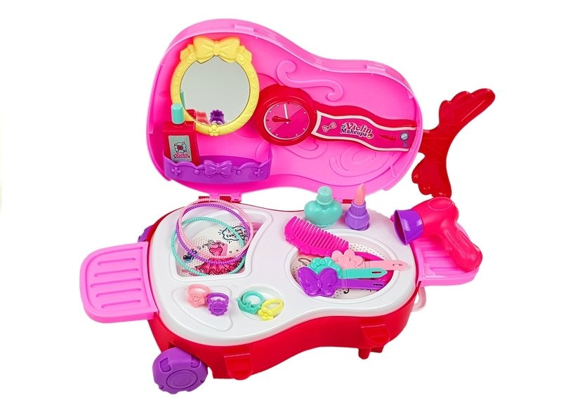 Zestaw piękności to wspaniała zabawka dla wszystkich dziewczynek kochających strojenie się przed lustrem. Komplet składający się z walizki ozdobionej lusterkiem, a także wielu plastikowych akcesoriów, pozwoli dziecku na długą i wesołą zabawę. Możliwość wcielenia się w kosmetyczkę z pewnością zachwyci każdego malucha. Kolorowa toaletka posiada kółka i rączkę, co znacznie ułatwia przemieszczanie się dziecka z walizka w kształcie Skrzypiec.