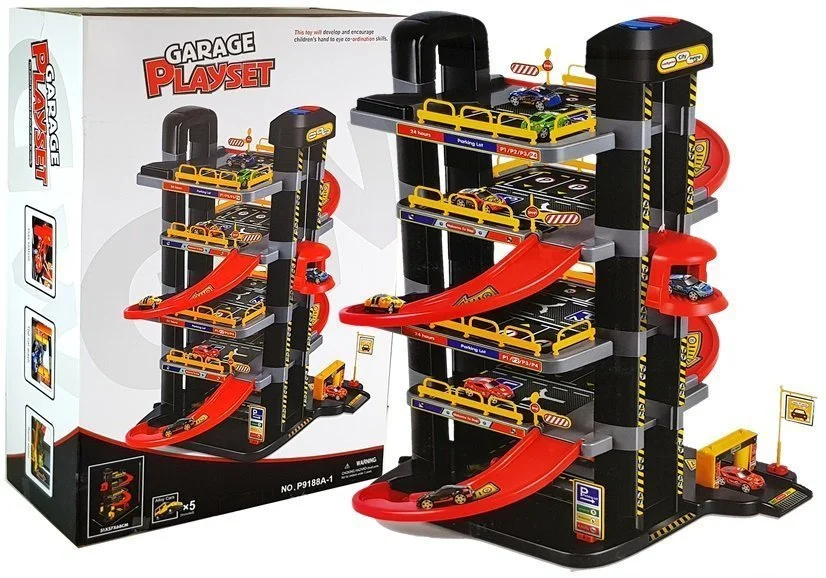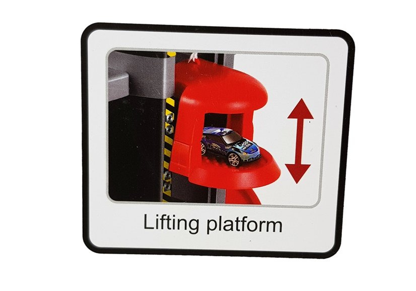 Parking składa się z 5 poziomów. Rozpoczynając od poziomu 2 do 5 mamy parking, gdzie Twój maluch może zaparkować swoje autka. Kolejne poziomy połączone są zjazdami oraz windą. Super zaletą jest to, że na szczycie budowli znajdują się dwa przyciski sterujące windą. Autka mogą jeździć dzięki niej w góry i w dół, a towarzyszą temu światełka, które dodają efektu. Po drodze napotka wiele atrakcji takich jak: serwis, myjnia czy stacja paliw.
