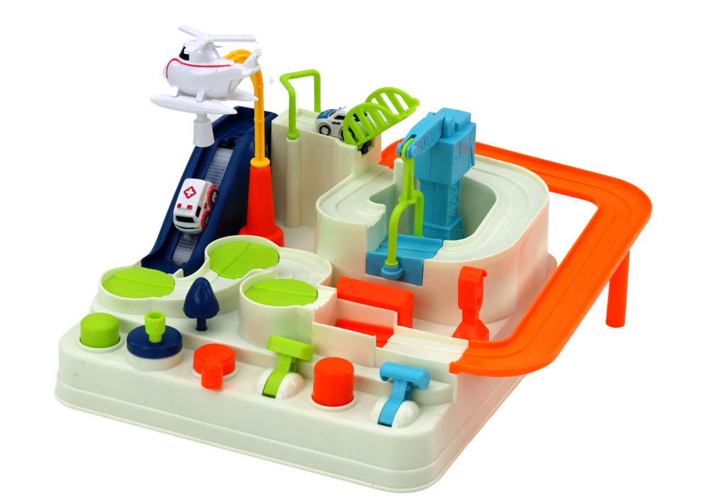 Zestaw składa się z wieloelementowego, kolorowego toru przeszkód, który został starannie zaprojektowany, aby zapewnić dziecku maksymalną frajdę i stymulować jego wyobraźnię. Razem z dwoma samochodzikami, maluch może pokonywać różnorodne przeszkody, takie jak zjeżdżalnie czy mosty zwodzone, używając do tego celu specjalnych przycisków i gałek umieszczonych na dole planszy.