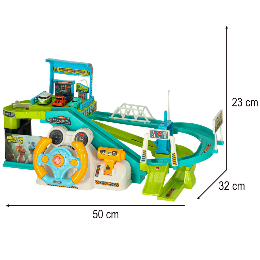 Tor samochodowy jest pełen zakrętów i wzniesień, po których jeżdżą cztery samochodziki. Winda, którą można obsługiwać ręcznie lub automatycznie, umożliwia łatwe wjeżdżanie autek na szczyt toru. Kierownica posiada trzy przyciski aktywujące efekty dźwiękowe, co dodatkowo uatrakcyjnia zabawę.