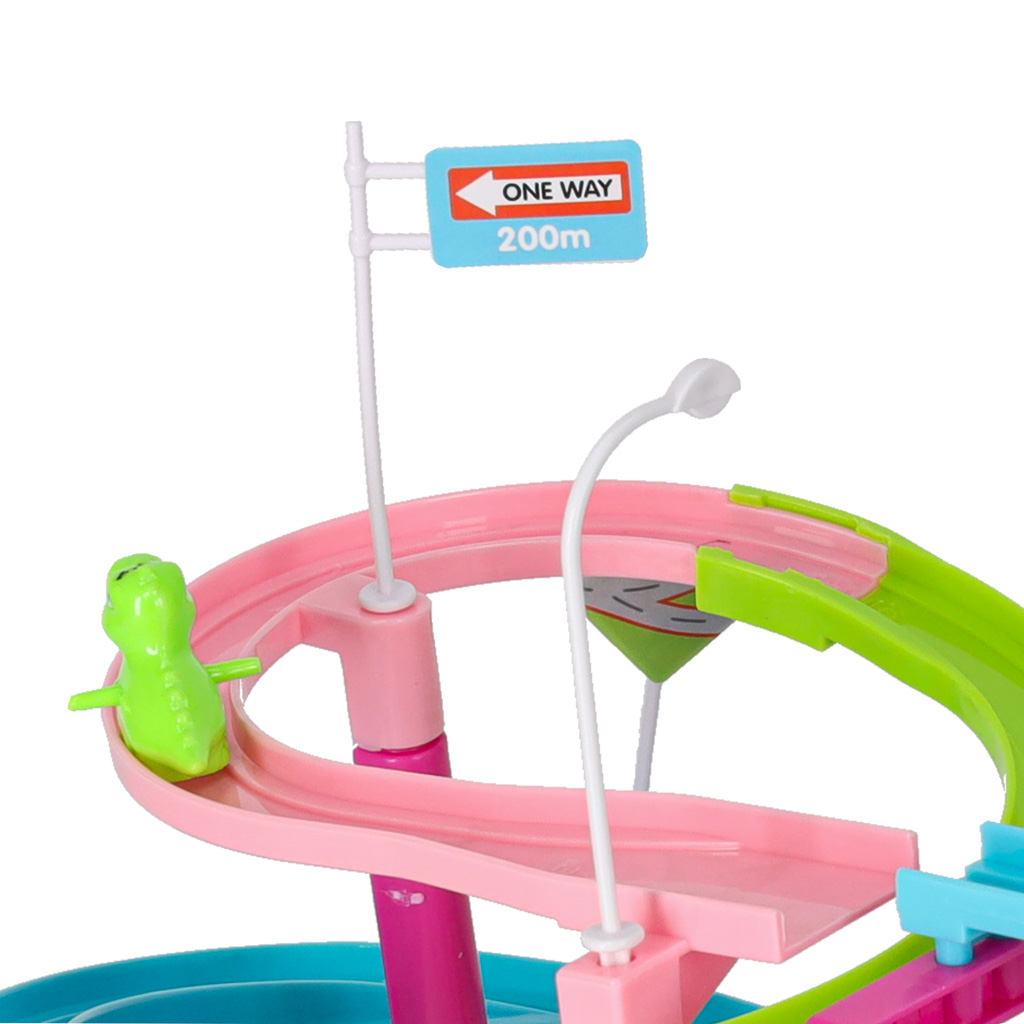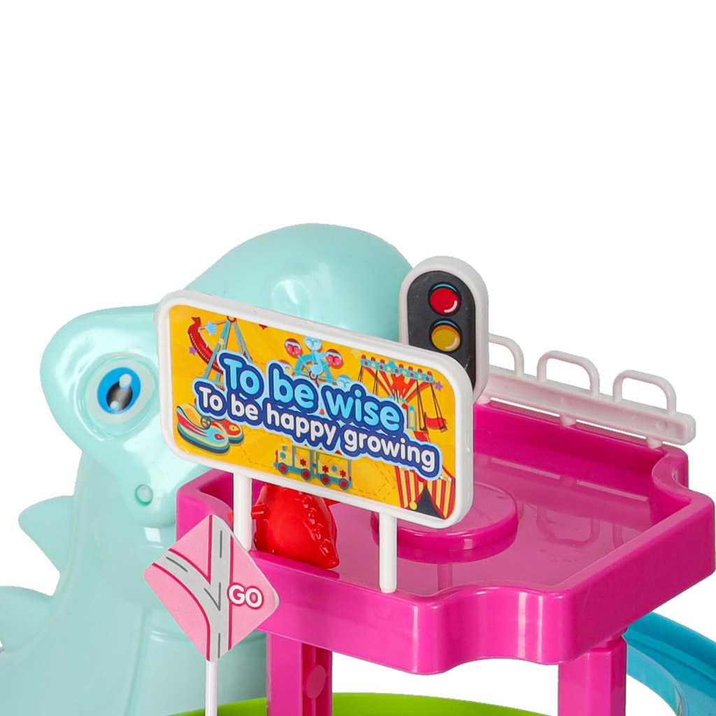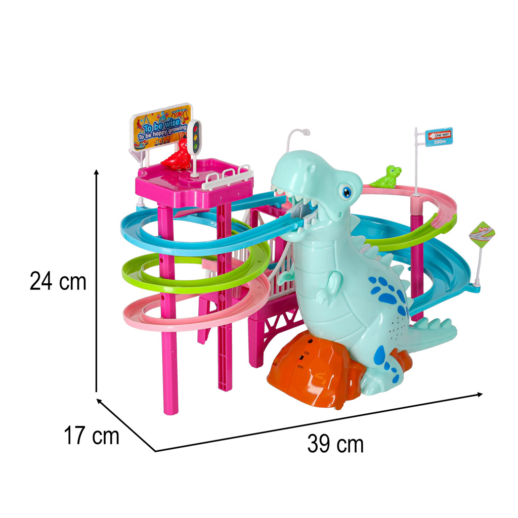 Tor wydaje dźwięki, co dodatkowo uatrakcyjnia zabawę. Gdy samochodziki poruszają się, duży dinozaur wydaje dźwięk porykiwania, co sprawia, że zabawa staje się jeszcze bardziej realistyczna i emocjonująca.