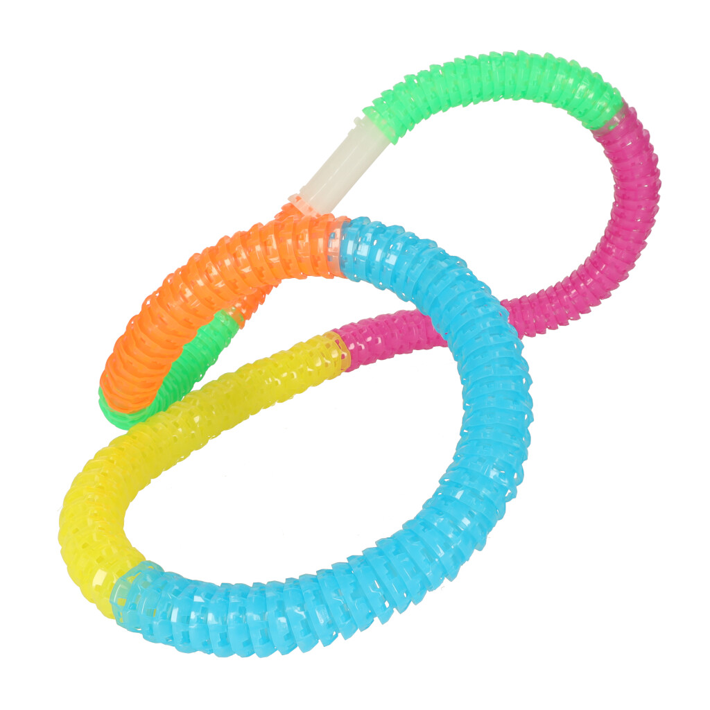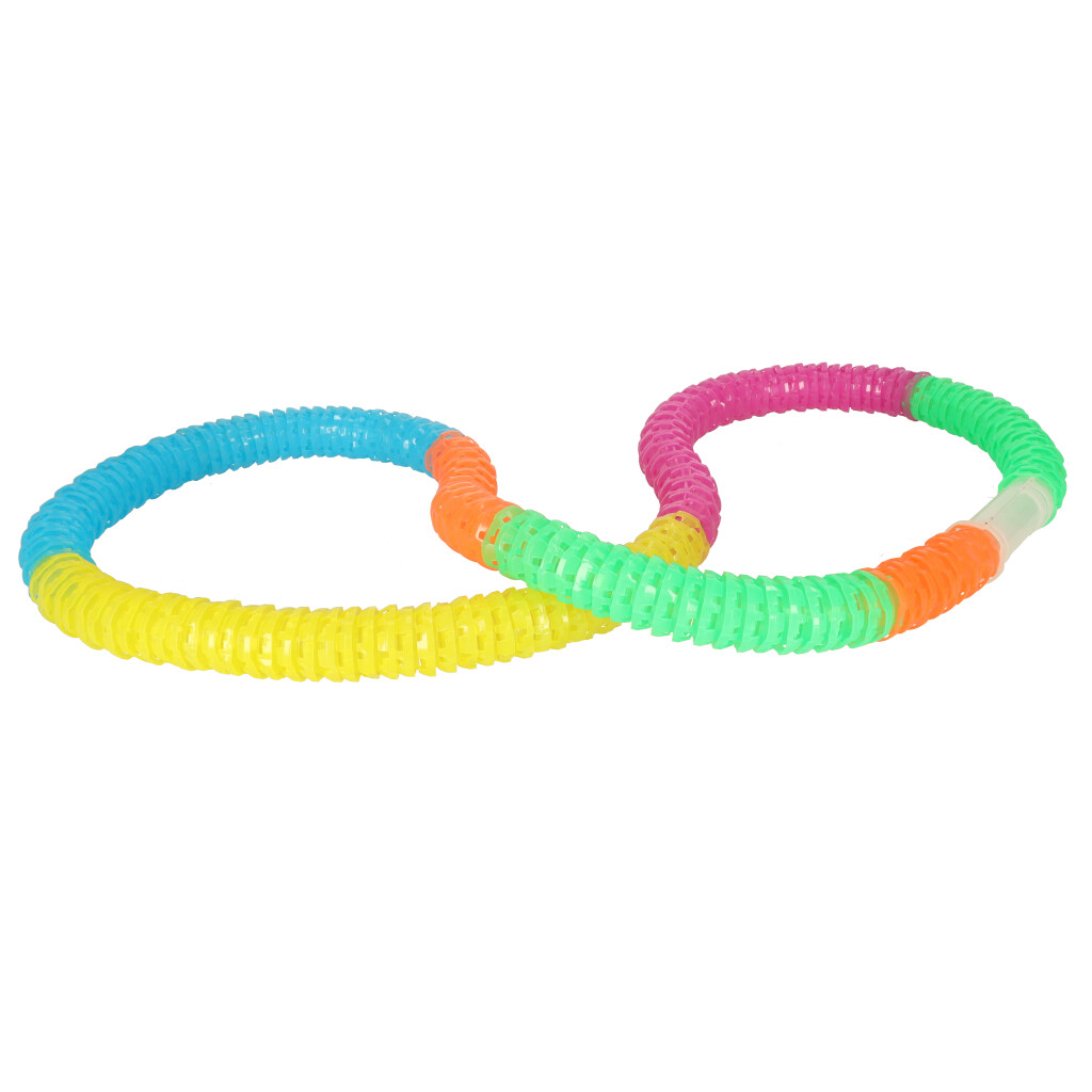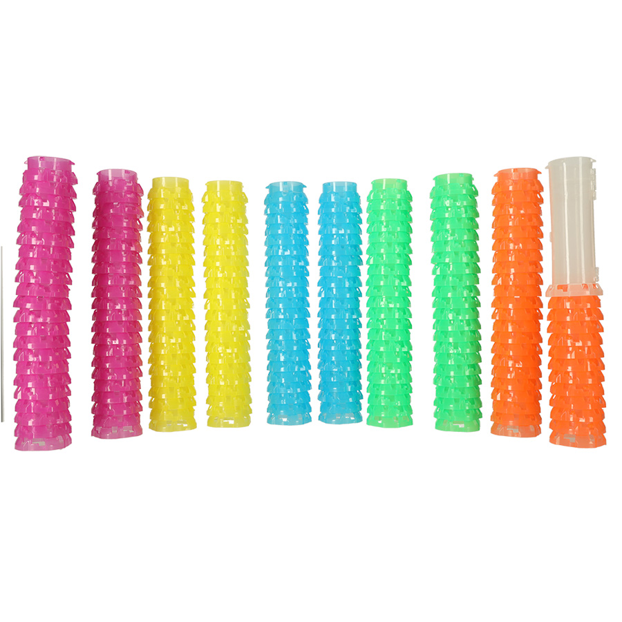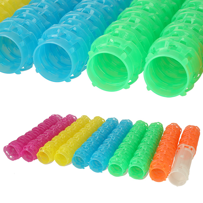 Klocki w pięciu kolorach – żółtym, różowym, zielonym, niebieskim i pomarańczowym – pozwolą na zbudowanie kolorowego toru, który zachwyci każdego malucha. Dzięki oryginalnemu systemowi łączenia elementów, tor może być konstruowany na dwa sposoby: luźno, co umożliwia zakręty, lub sztywno, co pozwala na budowanie pionowych konstrukcji.