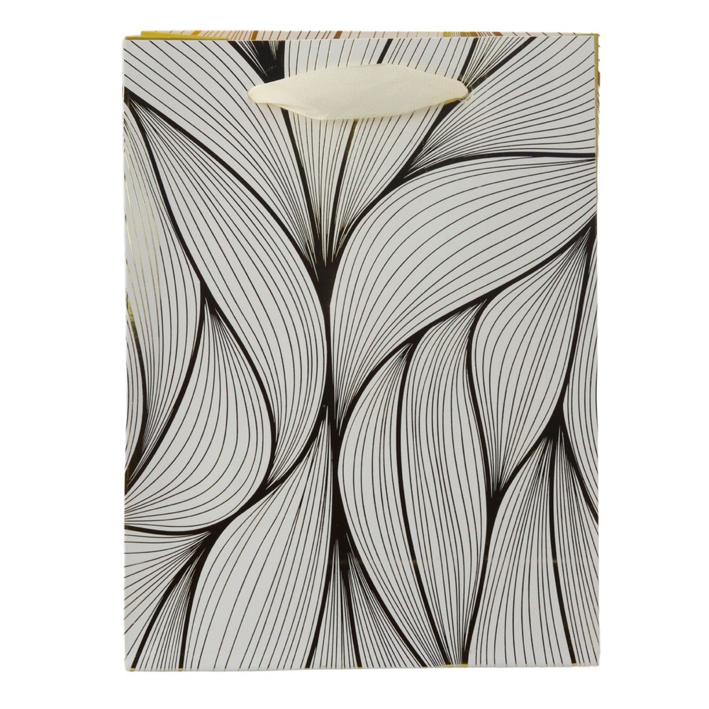 Złote linie na kolorowym tle tworzą efekt delikatnych fal, które dodają całości dynamiki i subtelnej elegancji. Mocne sznurkowe uchwyty w dopasowanym kolorze zapewniają wygodne przenoszenie, a solidna konstrukcja gwarantuje bezpieczeństwo nawet przy cięższych upominkach.