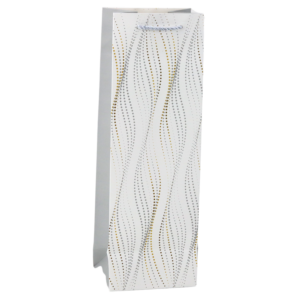 Elegancka torba prezentowa stworzona z myślą o pakowaniu butelek wina, szampana lub innych alkoholi. Nowoczesny design z dekoracyjnym, błyszczącym wzorem fal przyciąga wzrok i dodaje całości wrażenia luksusu. Złote, połyskujące linie odbijają światło, tworząc elegancki efekt wizualny, który doskonale wpisuje się zarówno w formalne, jak i bardziej kameralne wydarzenia.