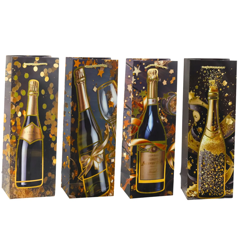 Elegancka torba prezentowa na butelkę to doskonały sposób na wyjątkowe zapakowanie alkoholu na specjalną okazję. Wykonana z wysokiej jakości papieru, torba wyróżnia się luksusowym designem przedstawiającym butelkę szampana otoczoną złotymi mieniącymi się elementami, które dodają jej blasku i elegancji. Efekt połysku sprawia, że torba prezentuje się niezwykle efektownie i przyciąga wzrok.
