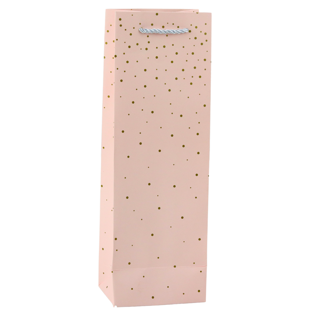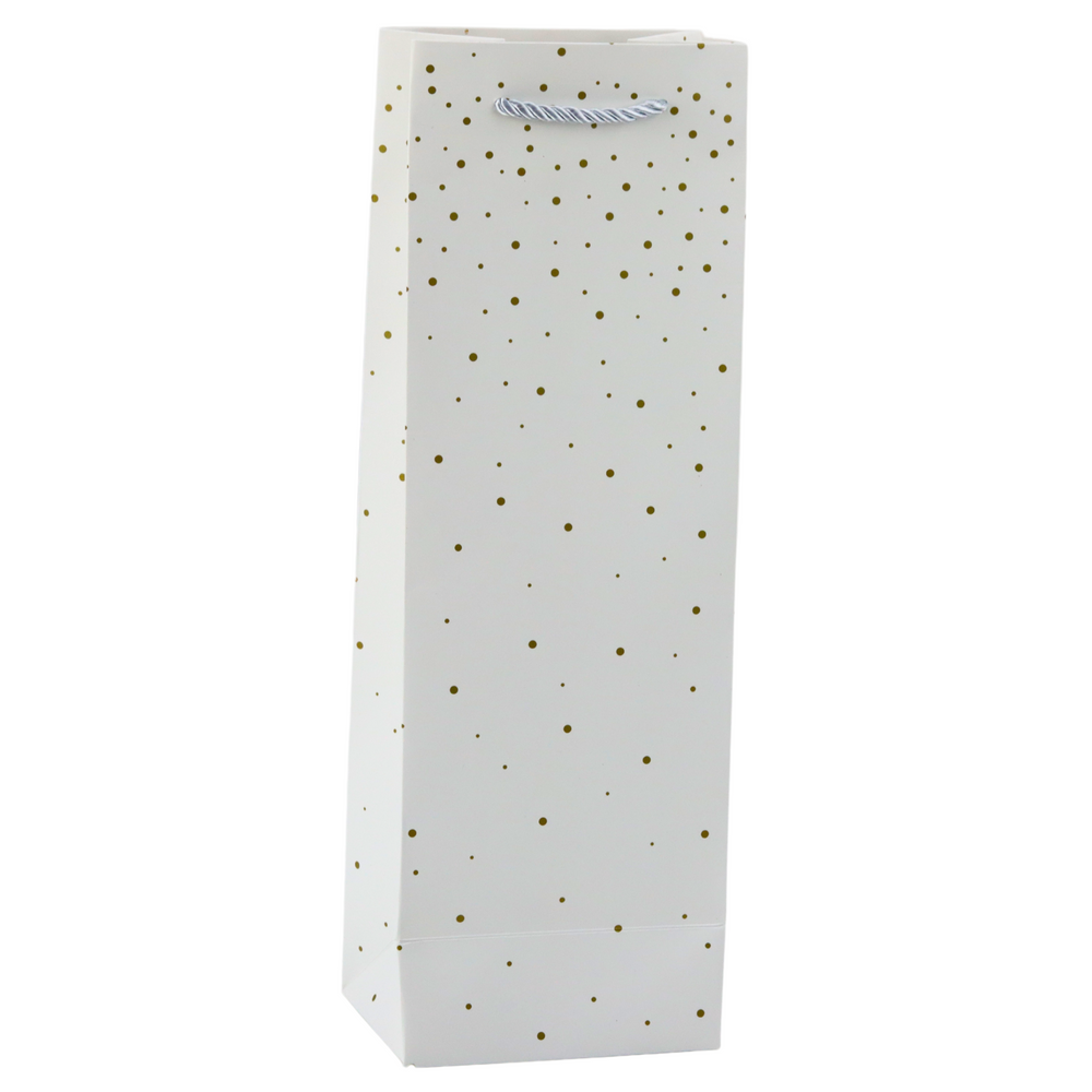 Elegancka torba prezentowa na butelkę to doskonały sposób na efektowne zapakowanie alkoholu lub innego trunku na każdą okazję. Wykonana z wysokiej jakości papieru, torba wyróżnia się minimalistycznym, a zarazem luksusowym designem. Pokryta jest subtelnym wzorem w postaci drobnych, złotych kropek, które dodają jej elegancji i szyku.