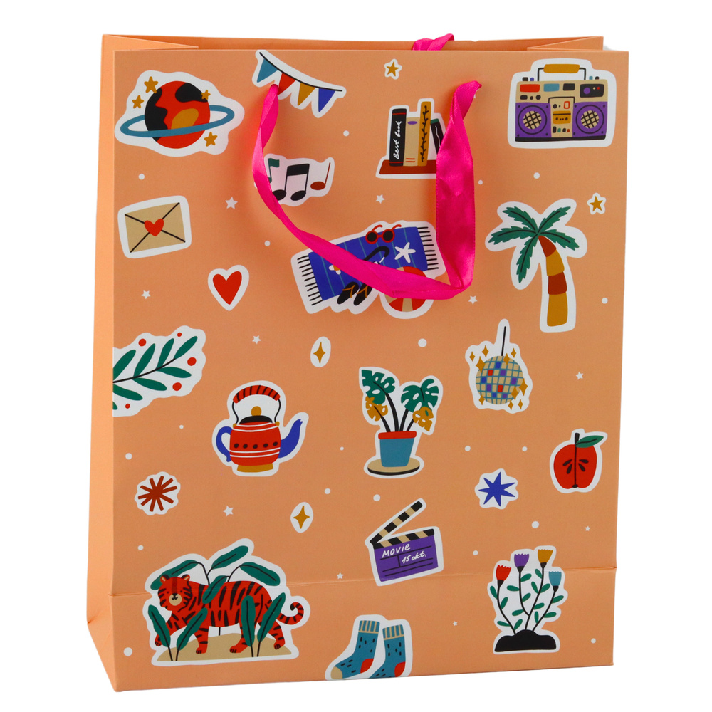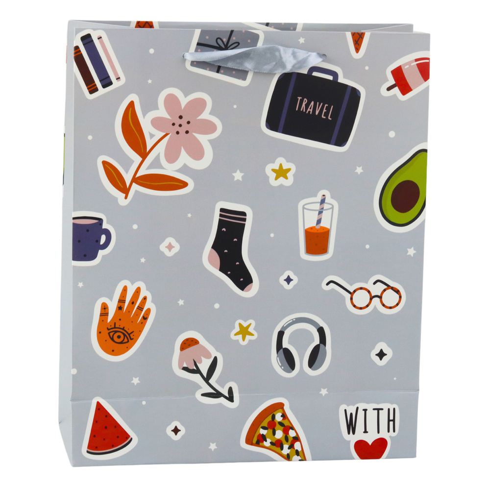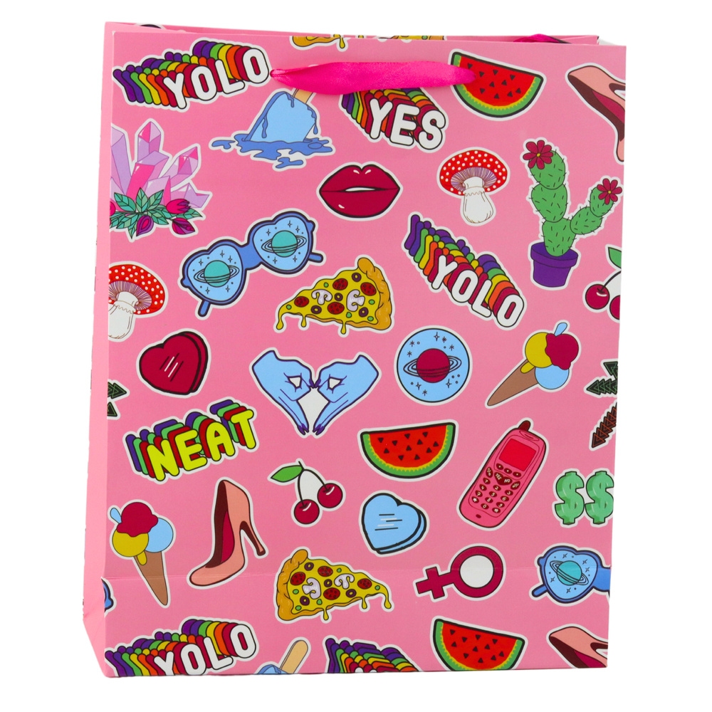 Torba prezentowa z naklejkowym motywem, która zachwyca żywymi kolorami i nowoczesnym stylem! Torba ozdobiona jest różnorodnymi grafikami w formie kolorowych naklejek, takich jak serca, usta, owoce, napisy oraz symbole młodzieżowe i lifestylowe. Taki wzór sprawia, że torba wygląda wyjątkowo modnie i oryginalnie.