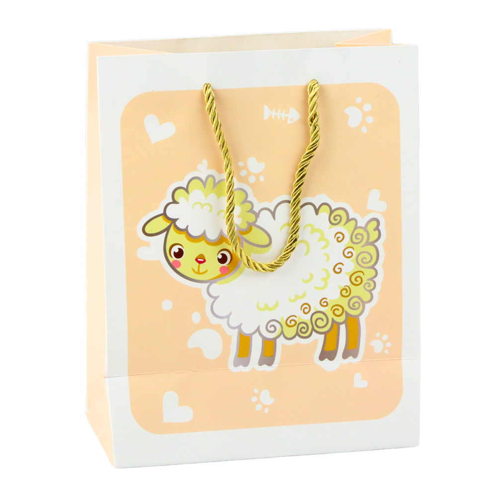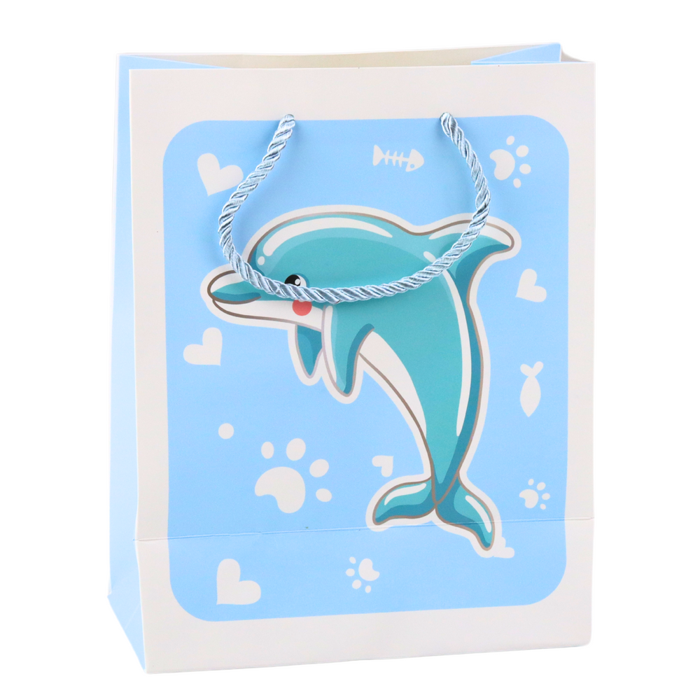 Kolorowa torba prezentowa to idealne rozwiązanie do zapakowania prezentu dla dziecka lub miłośnika uroczych, bajkowych wzorów. Torba wykonana została z wysokiej jakości papieru, który zapewnia trwałość i estetyczny wygląd. Na froncie każdej torby znajdują się wesołe, trójwymiarowe (3D) motywy zwierzątek: flaming, delfin, miś polarny oraz owieczka – każde z nich otoczone kolorowym tłem i uroczymi serduszkami oraz łapkami.