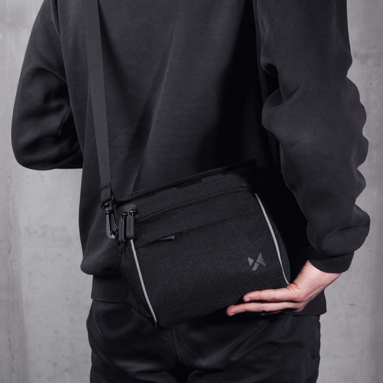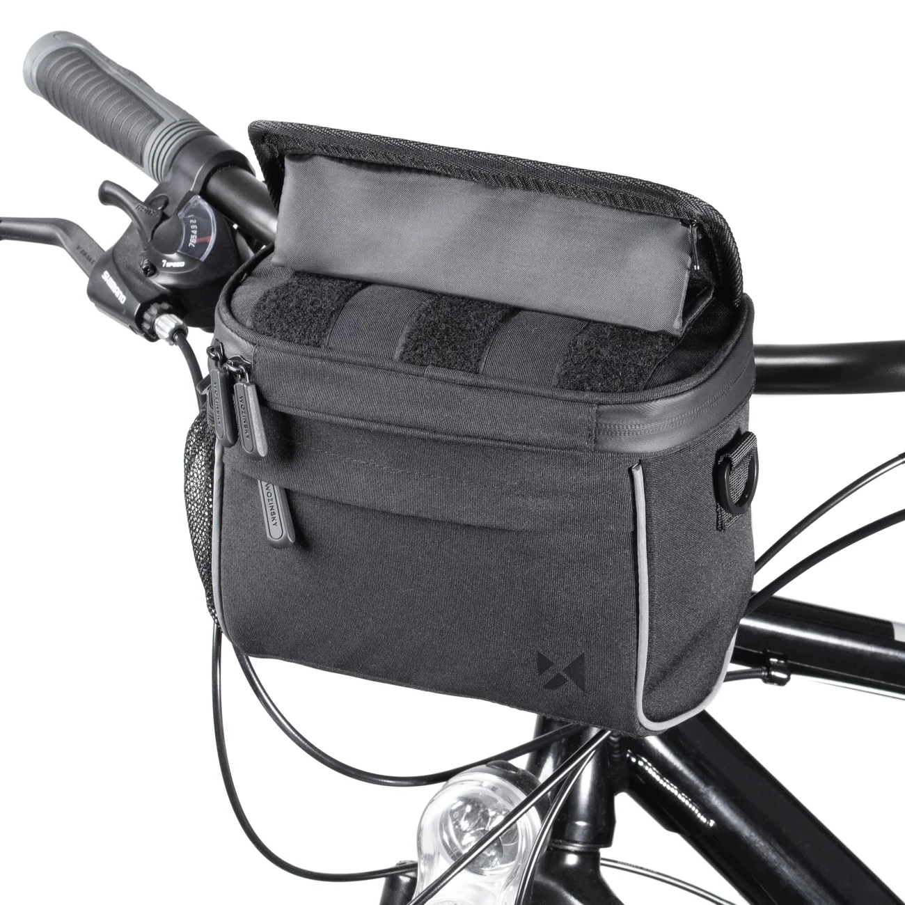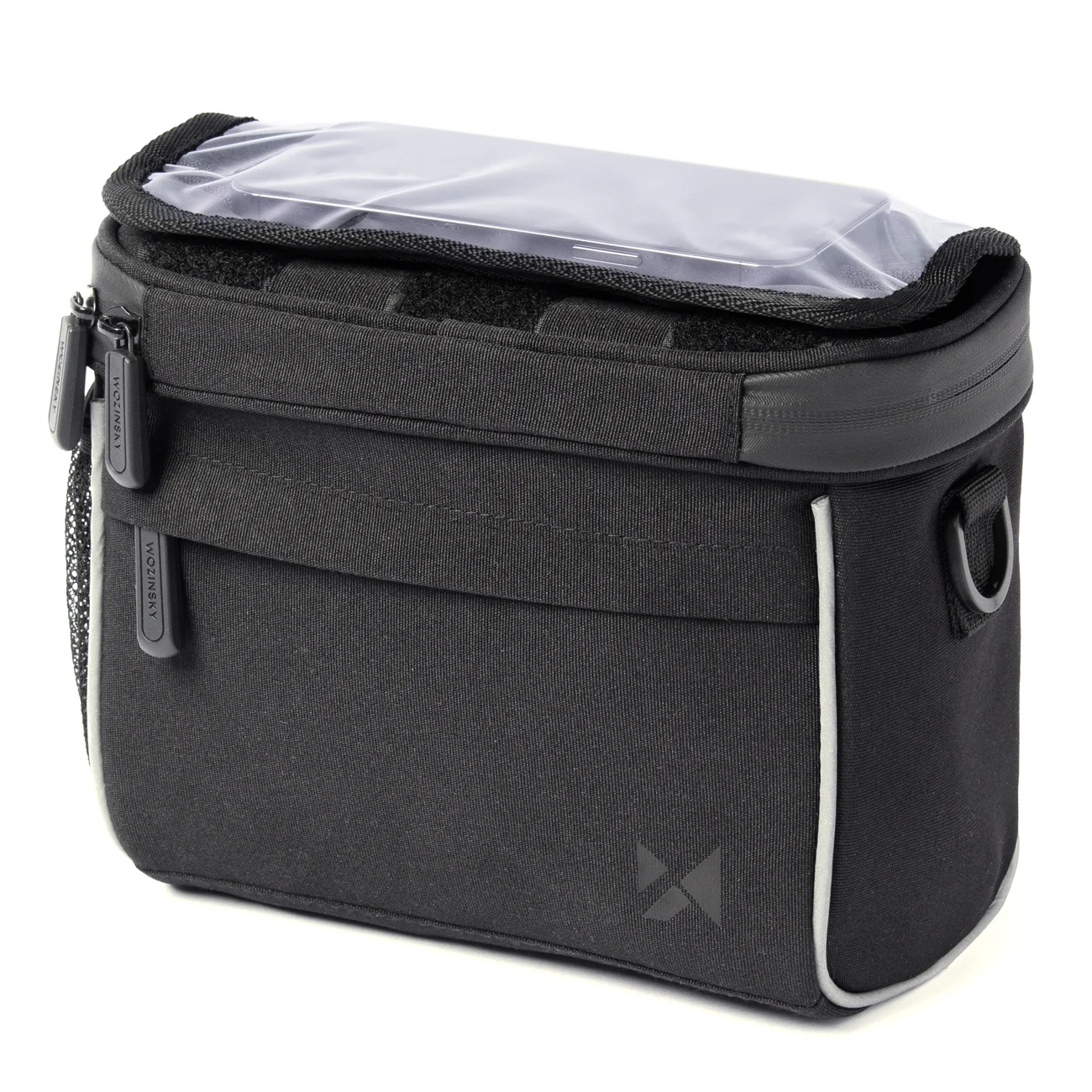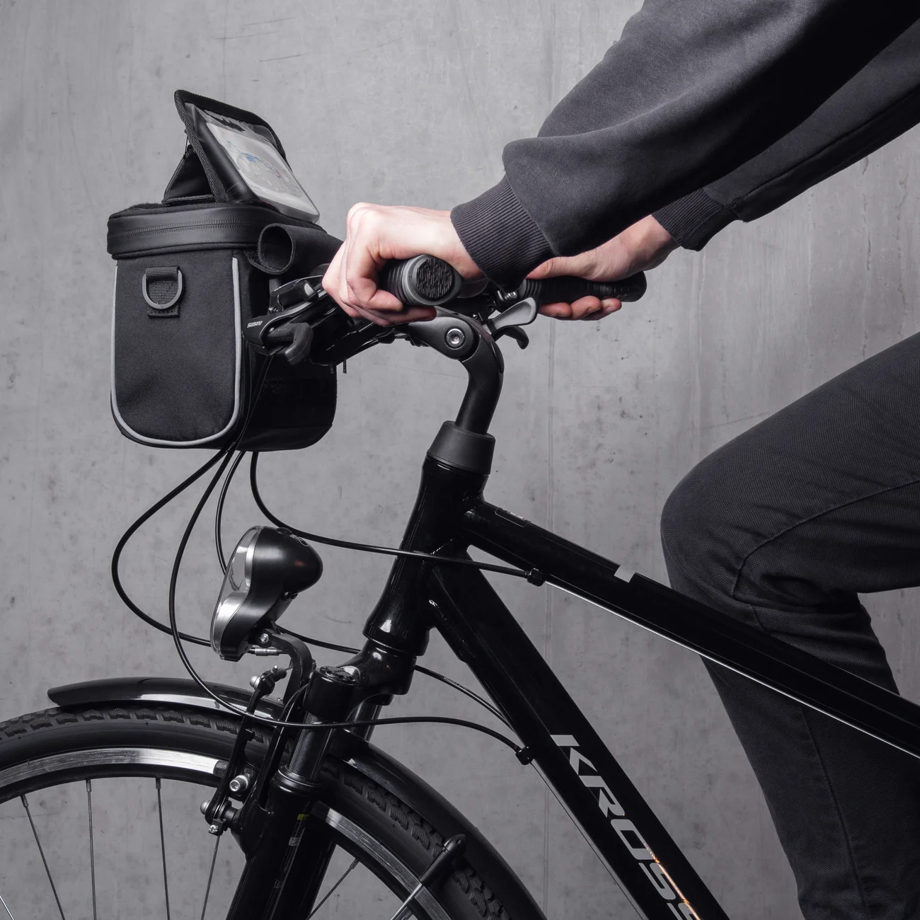 W zestawie znajduje się torba rowerowa z paskiem na ramię, idealna do użycia na kierownicy.