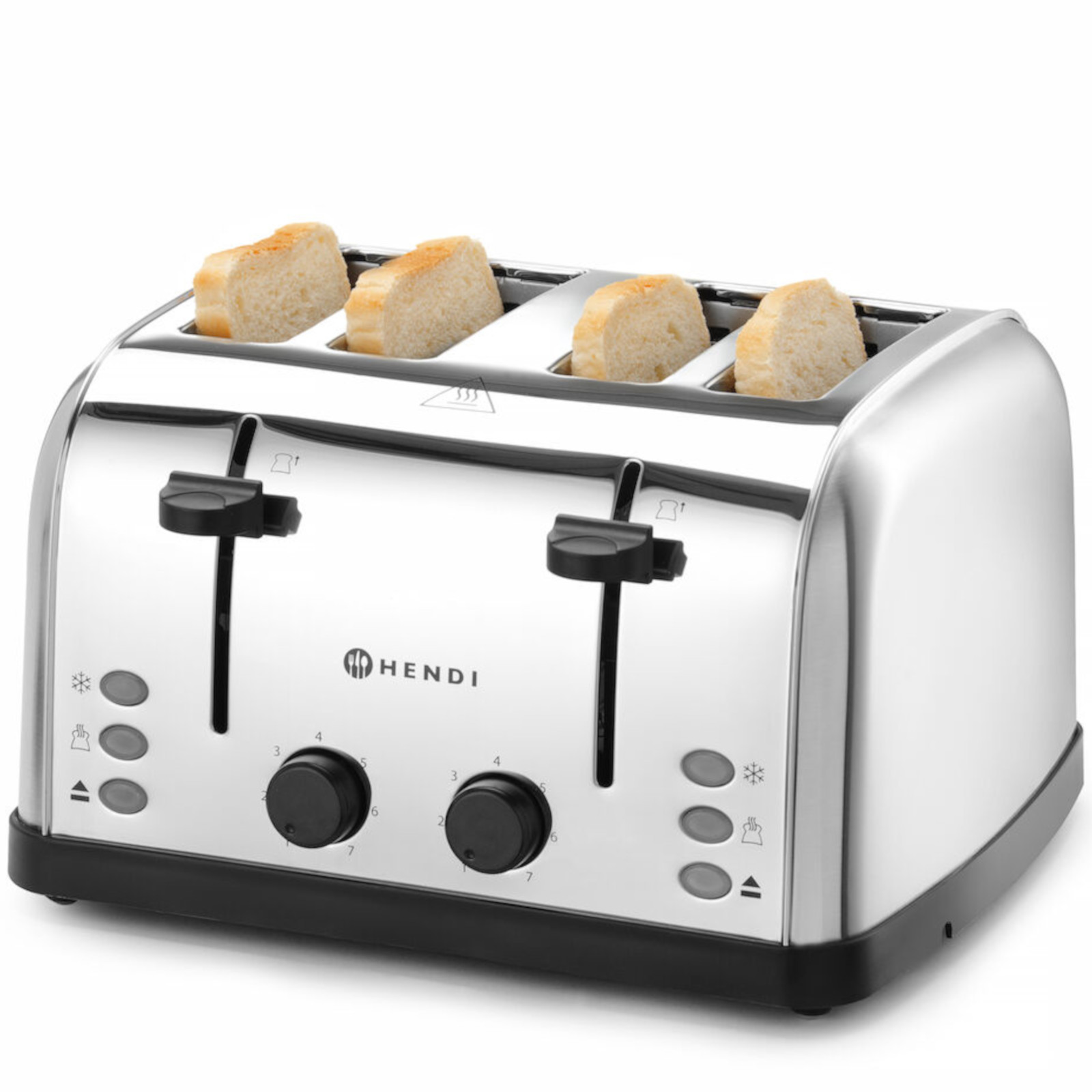 Przygotuj pyszne tosty w kilka chwil dzięki naszemu tosterowi marki HENDI. Urządzenie umożliwia jednoczesne opiekanie 4 kromek chleba, co czyni je idealnym wyborem dla większych rodzin i spotkań z przyjaciółmi.