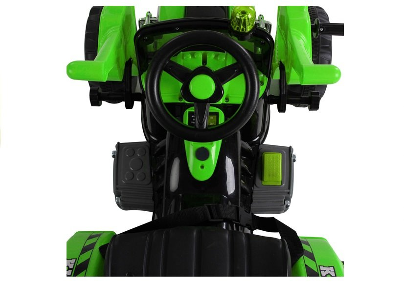 Prezentowany traktor w zielonym odcieniu z pewnością wywoła uśmiech na twarzy dziecka, gwarantując mu zupełnie inny wymiar zabawy. Po wygodnym usadowieniu się na fotelu kierowcy, maluch może wcisnąć guzik START, wybrać przełącznikiem kierunek jazdy oraz prędkość — niską lub wysoką, a następnie docisnąć nóżką pedał gazu. Uwaga, traktor ruszył przed siebie! Podczas zabaw malucha zadbajcie o to, by zapinał pasy bezpieczeństwa, a także korzystał z niskiej prędkości — z czasem przestawcie ją na wyższą, by kierowca odczuwał jeszcze większą frajdę z zabawy.