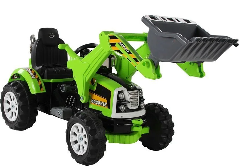 Koparko-ładowarka dla kilkulatków została wykonana z atestowanego, solidnego tworzywa w kolorze zielonym. Jej konstrukcja oparta jest na czterech kołach — przednich o wymiarach 28 cm x 10 cm oraz tylnych - 32 cm x 13 cm. Koła te posiadają bieżnikowaną strukturę, dzięki czemu maluch może przejechać swą koparką po nawierzchniach różnego typu, nie generując uciążliwego hałasu podczas swej zabawy. Pojazd dla malucha zasilany jest podwójnym akumulatorem o łącznej mocy 2x6V7Ah, czemu towarzyszą silniki 2x45W. Podzespoły te umożliwiają zabawę w prędkości w przedziale od 2 do 6 km/h. Traktor przeznaczony jest zarówno dla chłopców, jak i dziewczynek powyżej 3. roku życia — jedynym ograniczeniem jest obciążenie powyżej 30 kg. Zielony pojazd budowlany posiada certyfikat CE, zapakowany jest w oryginalny karton, wewnątrz którego dodatkowo znajduje się akumulator, ładowarka i instrukcja ułatwiająca samodzielny montaż.