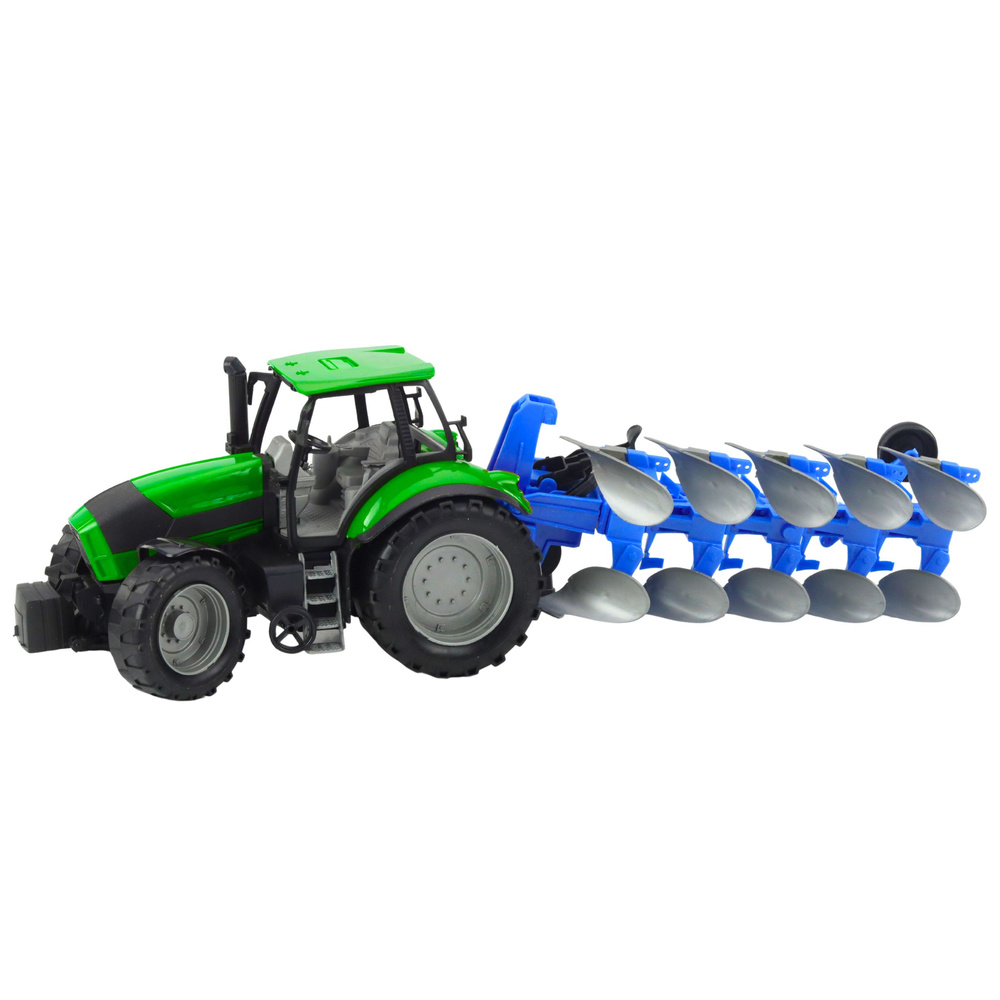 Zestaw zawiera zielony traktor z masywnym pługiem w kolorze niebieskim. Pług wyposażony w wiele ostrzy pozwala odgrywać realistyczne sceny pracy w polu. Całość zapakowana jest w estetyczne opakowanie z przezroczystym frontem, które ułatwia przechowywanie i świetnie nadaje się na prezent.