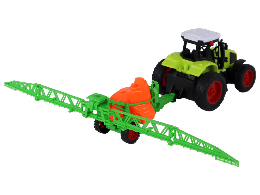 Kabina kierowcy jest widoczna wewnątrz traktora, co dodaje realizmu i pozwala umieścić w niej figurkę kierowcy lub inne detale, co sprawia, że zabawa staje się jeszcze bardziej atrakcyjna. W zestawie znajduje się przyczepa, która jest wierną kopią tych używanych w rolnictwie do zraszania i oprysku roślin. Przyczepa wyposażona jest w dwa rozkładane ramiona, które służą do pryskania roślin, co pozwala na symulowanie różnych prac rolniczych.