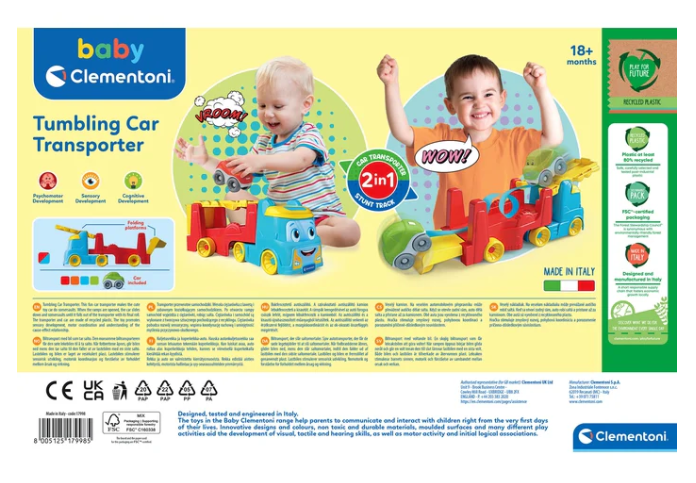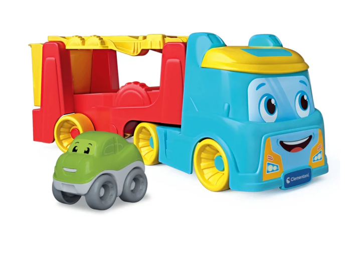 Kolorowa ciężarówka Baby Clementoni zmienia się w naczepę do transportu samochodzików!
