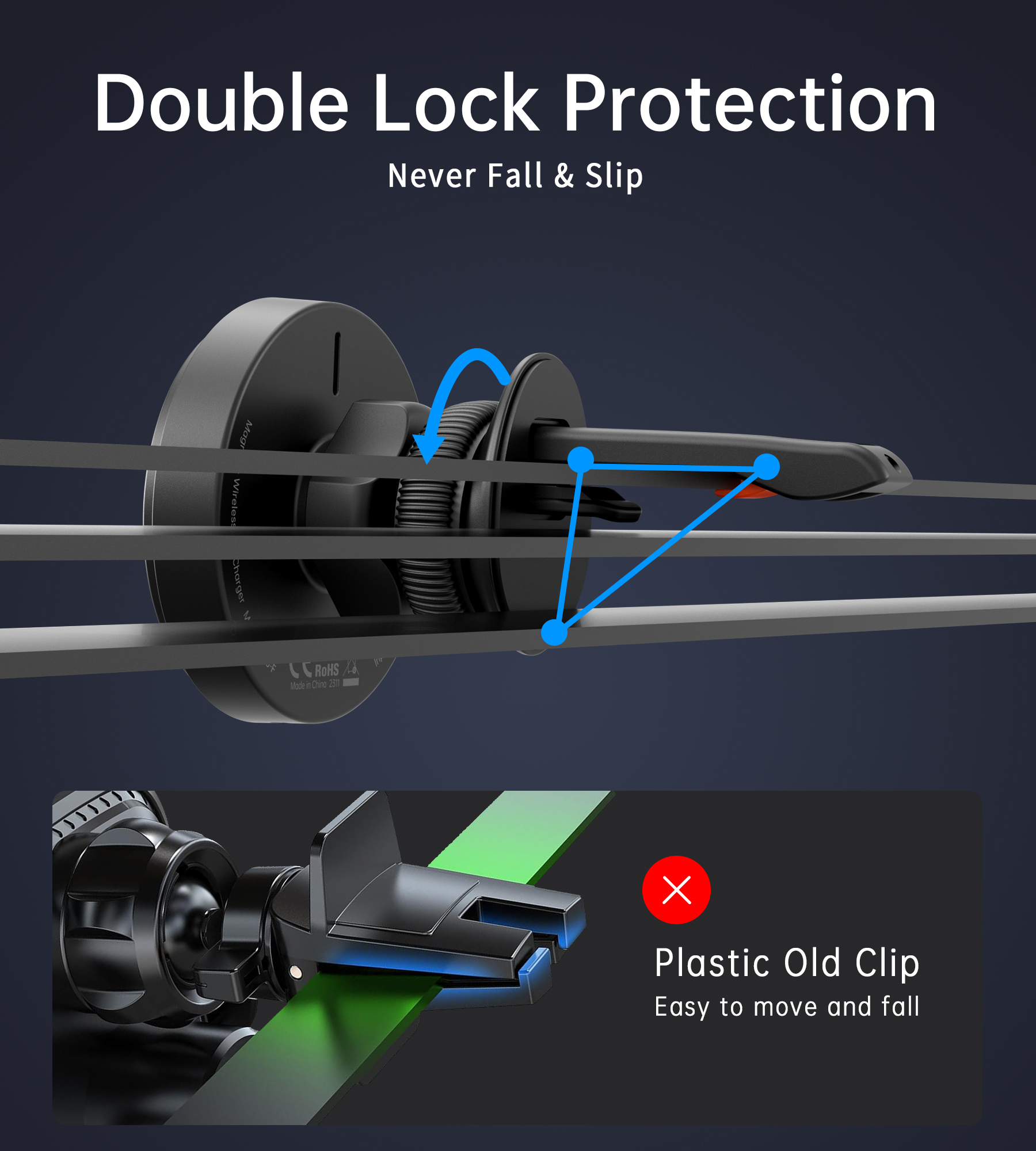 Uchwyt Choetech T205-F to praktyczne rozwiązanie, które umożliwia szybkie i wygodne ładowanie telefonu w samochodzie. Dzięki mocy ładowania do 15W, możesz naładować swój smartfon w mgnieniu oka. Specjalnie zaprojektowany klips z antypoślizgowym silikonem oraz podwójną blokadą zapewnia stabilność, niezależnie od warunków na drodze.