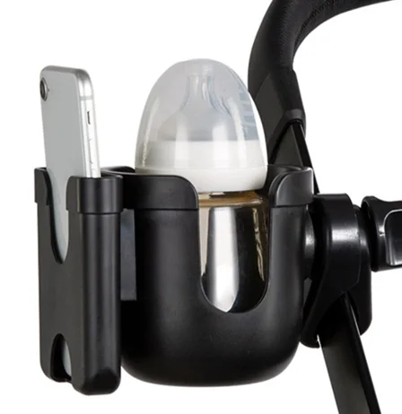 Uchwyt jest kompatybilny z większością wózków i pomieści różnorodne telefony oraz pojemniki na napoje, takie jak: