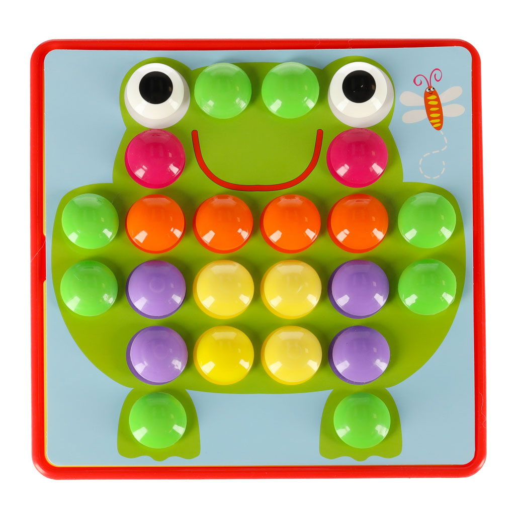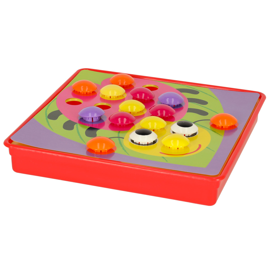 Guzikowa Mozaika to interaktywna układanka, która wspiera rozwój dzieci poprzez zabawę. Dzięki niej najmłodsi uczą się nazw kolorów, liczenia oraz rozpoznawania kształtów. Zabawa polega na wpinaniu kolorowych guzików w odpowiednie otwory na planszy, co angażuje ich kreatywność i wyobraźnię.