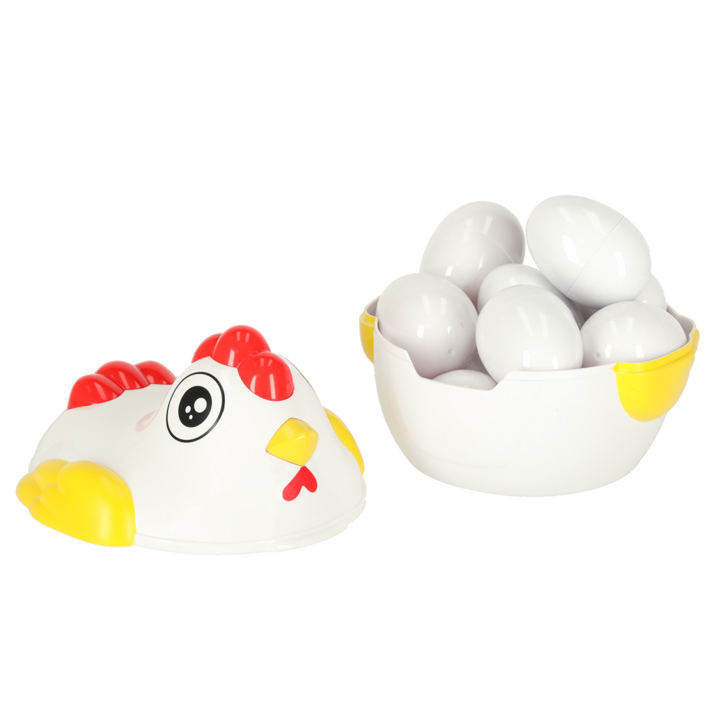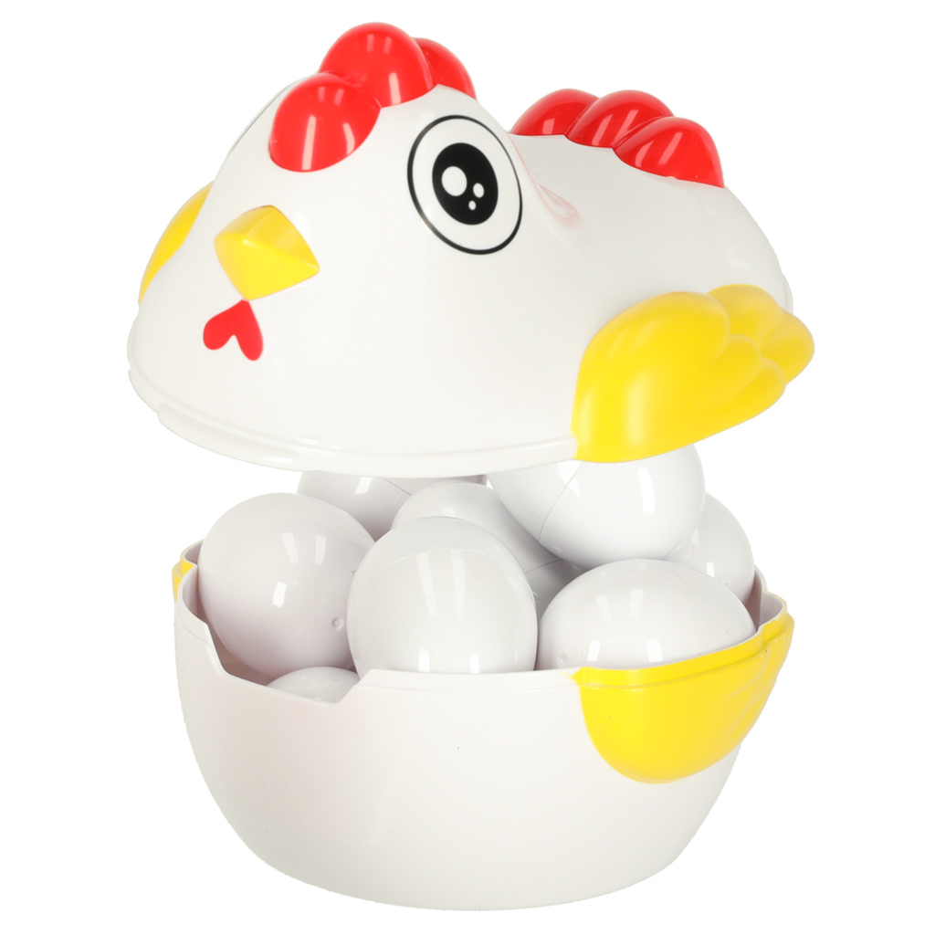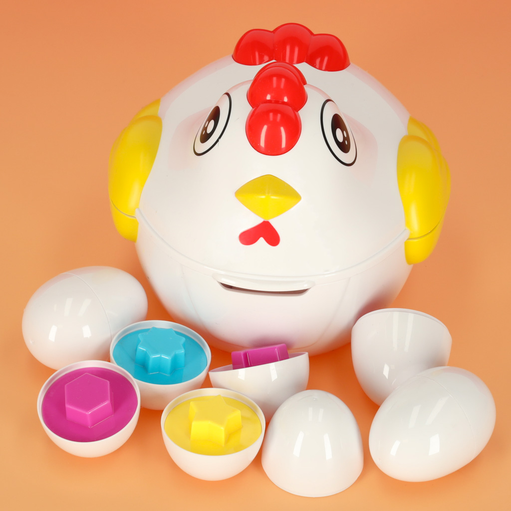 Wewnątrz kury znajduje się 12 plastikowych jajek, które można otwierać i ponownie łączyć. Każde jajko skrywa kształt, pasujący tylko do jednej konkretnej połówki. Dziecko ma za zadanie rozsypać jajka, otworzyć je i odnaleźć odpowiednie pary według kształtu i koloru.