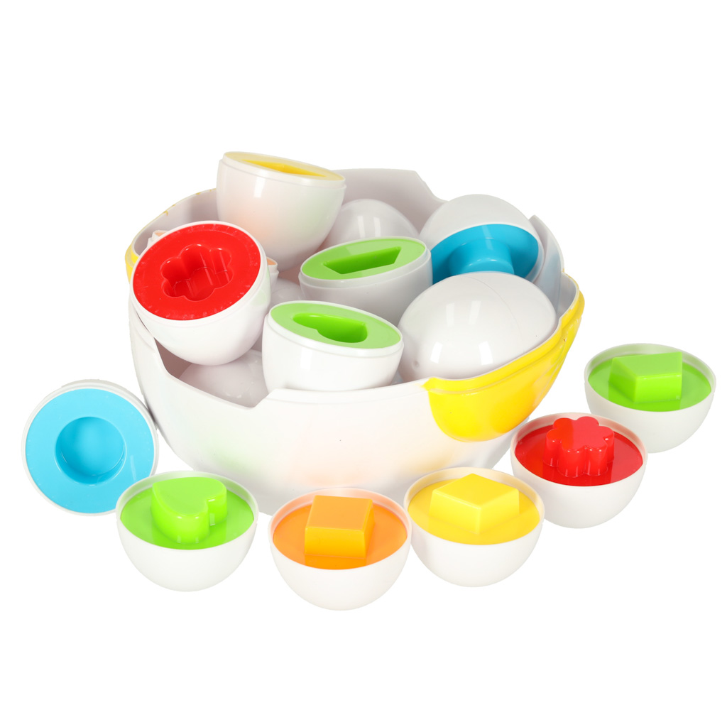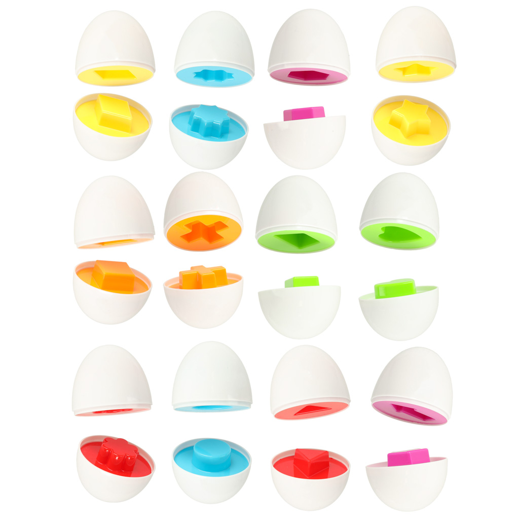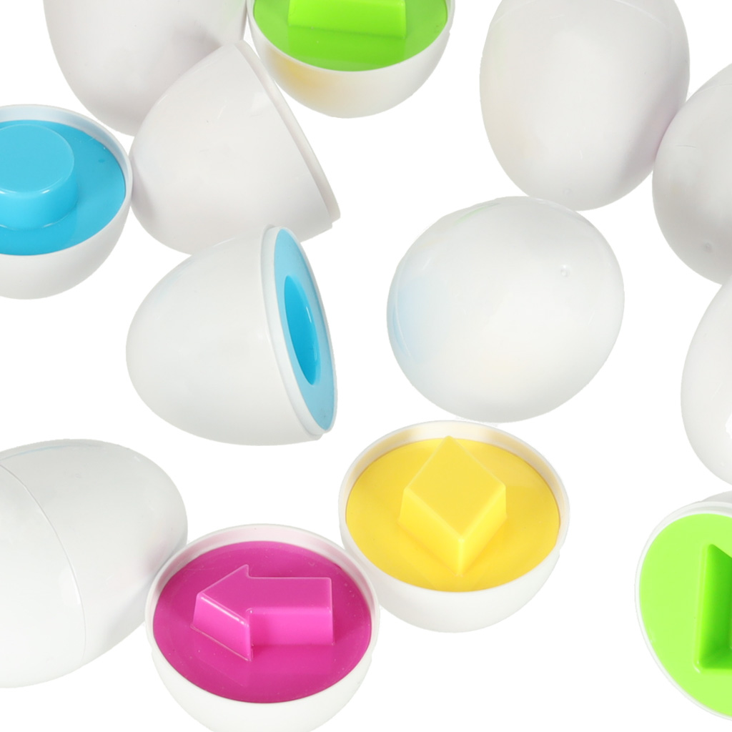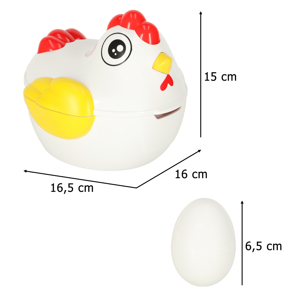 Wewnątrz kury znajduje się 12 plastikowych jajek, które można otwierać i ponownie łączyć. Każde jajko skrywa kształt, pasujący tylko do jednej konkretnej połówki. Dziecko ma za zadanie rozsypać jajka, otworzyć je i odnaleźć odpowiednie pary według kształtu i koloru.