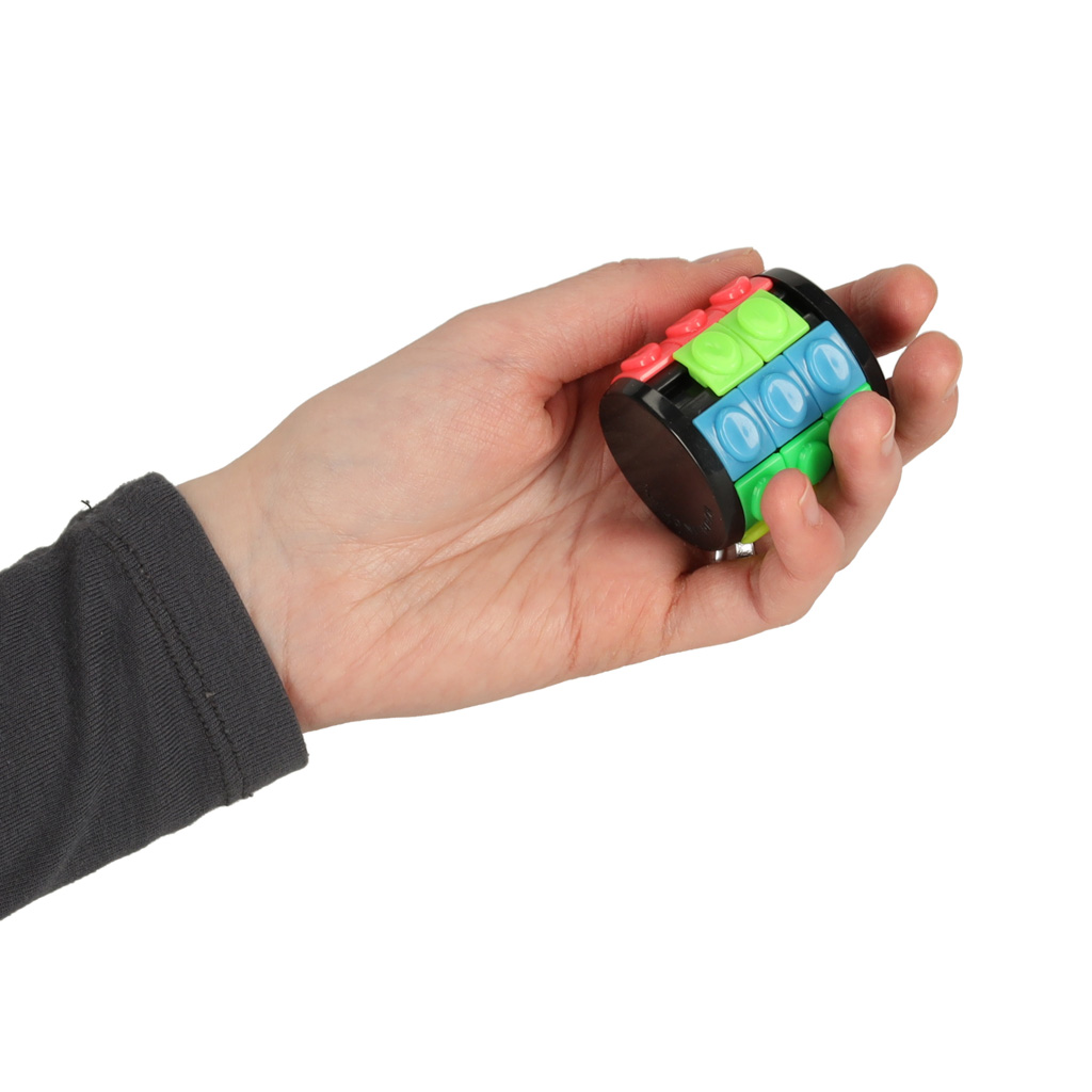 Pierścienie układanki można swobodnie obracać, a wolne miejsce w rzędzie umożliwia ruch kostek. Choć na pierwszy rzut oka układanka może wydawać się prosta, to wymaga logicznego myślenia i strategii.