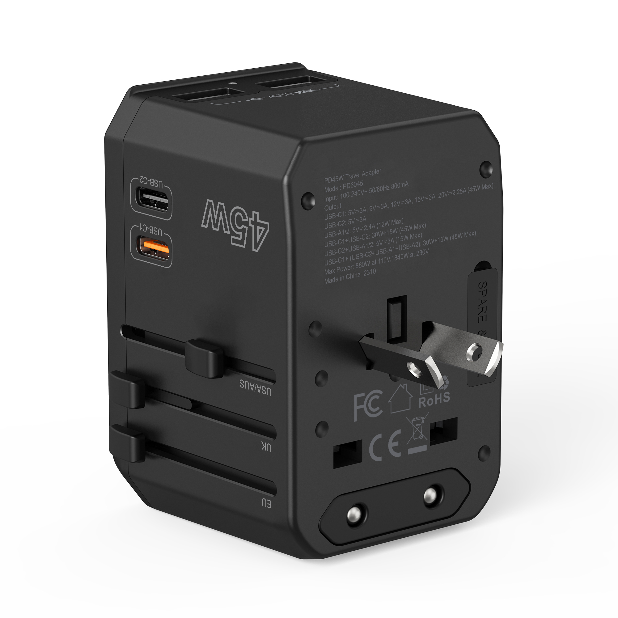 Wykonana w technologii GaN, ładowarka ma kompaktowe wymiary, co czyni ją doskonałym towarzyszem w podróży. Dodatkowo, wymienne wtyczki pozwalają na korzystanie z urządzenia w różnych standardach: USA, EU, UK oraz AU, co zwiększa jej uniwersalność.