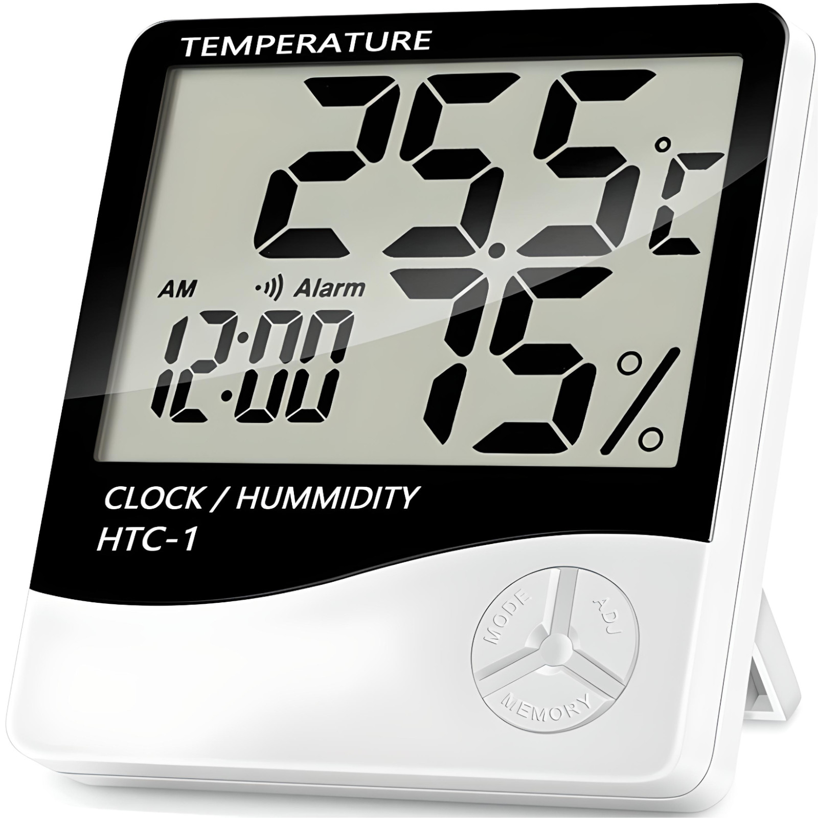 Termometr higrometr cyfrowy z zegarkiem budzikiem datą stojący na baterie 0-50C