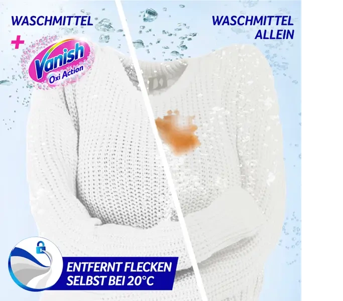 Vanish Oxi Action Powerweiss to skuteczny booster do bieli, który zapewnia jeszcze jaśniejsze białe pranie. Dzięki zaawansowanej formule, produkt odżywia białe tkaniny, usuwa plamy i eliminuje nieprzyjemne zapachy. Radzi sobie z uporczywymi zabrudzeniami, nawet w niskich temperaturach. Składniki wnikają głęboko w włókna odzieży, pozostawiając ją świeżą i czystą.