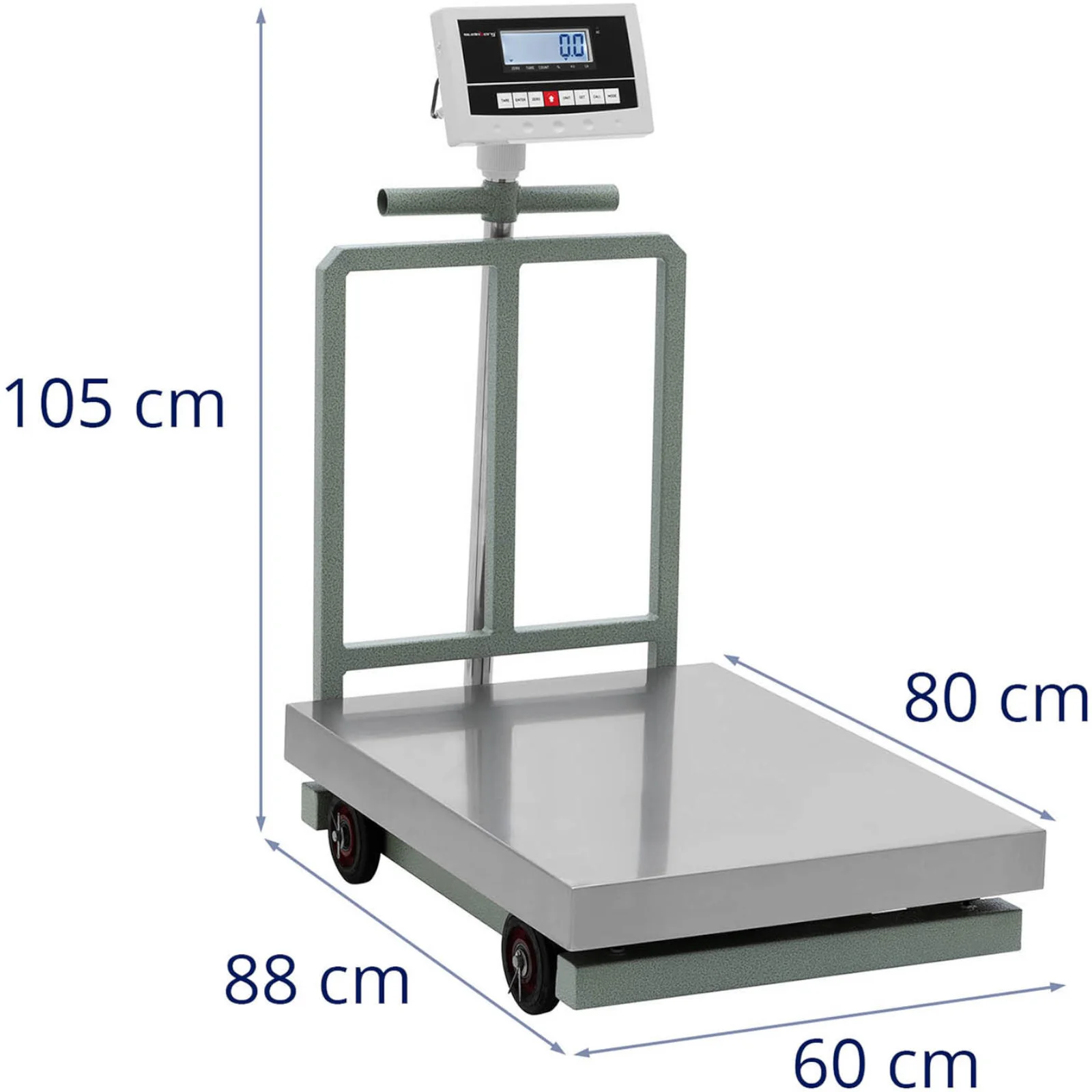 Urządzenie jest mobilne dzięki czterem kółkom, co ułatwia jego transport i użytkowanie w różnych lokalizacjach. Wyposażona w panel sterujący z wyświetlaczem LCD, umożliwia wygodny odczyt wyników dzięki dużym cyfrze o wysokości 27 mm. Waga może być zasilana zarówno z sieci, jak i za pomocą baterii, która zapewnia do 100 godzin pracy.
